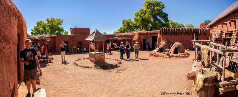 One of the first buildings you come across at Ranchos de las Golondrinas is the church. The church is the north building of a hacienda that has a central plaza with a well in the center and hornos for baking. Note the church has a pitched, tin roof, but the other buildings have flat roofs. The church originally had a flat roof as well, and the tin roof would have been added after 1850 when New Mexico became a US territory which opened up trade and goods to come in from the Eastern US. The ceiling of the church still has the horizontal vigas (timbers) that supported the original flat, dirt roof.