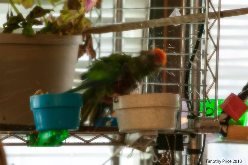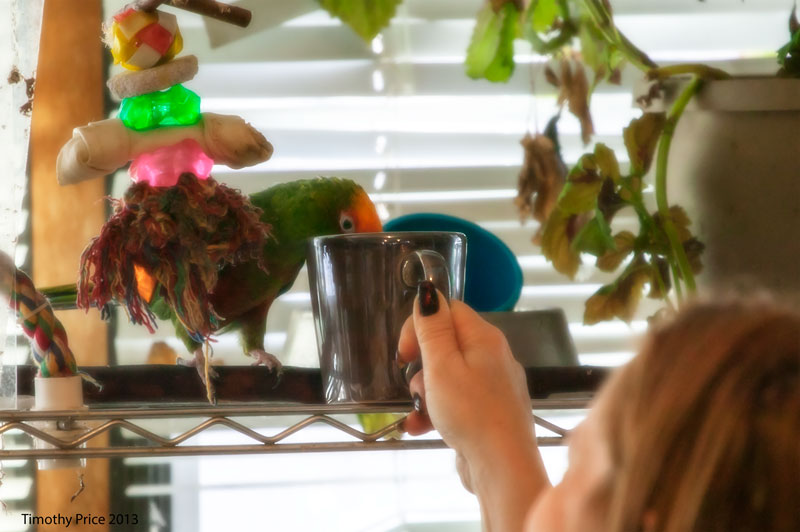 I had to get out my 17mm, super-wideangle lens to get a photo of Beaker impatiently waiting for the waffle that’s in the toaster oven. You can see the tips of his wings are a little blurry because he is fluttering them in anticipation. Guildenstern got up on the table, flopped himself down and waited to see what Laurie was having for breakfast. He wasn’t too sure about either the granola or the coffee.