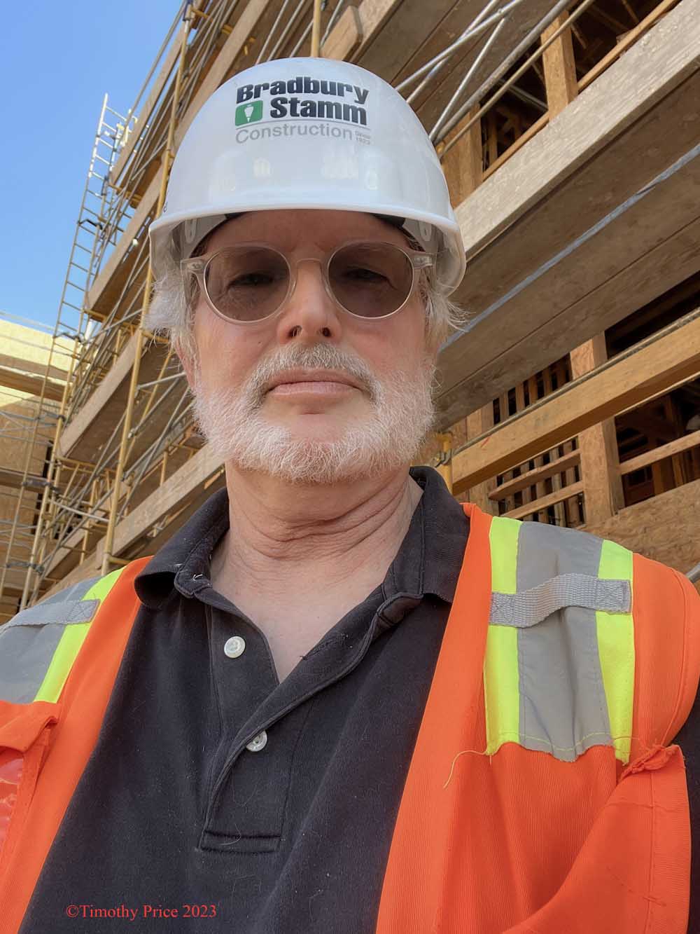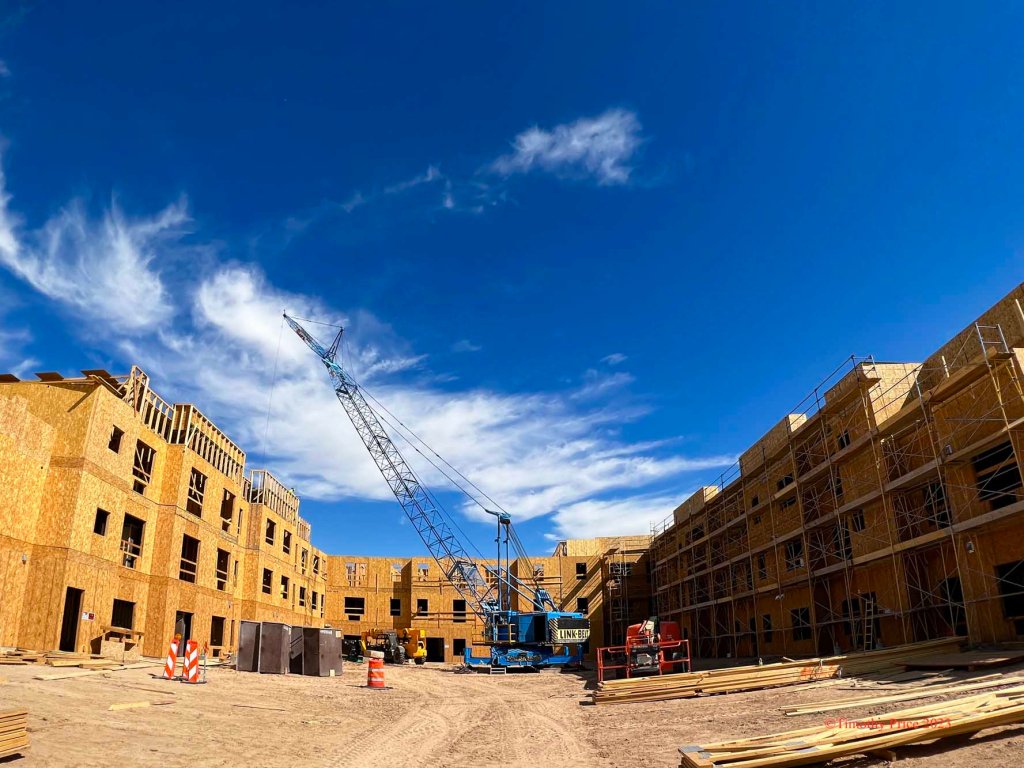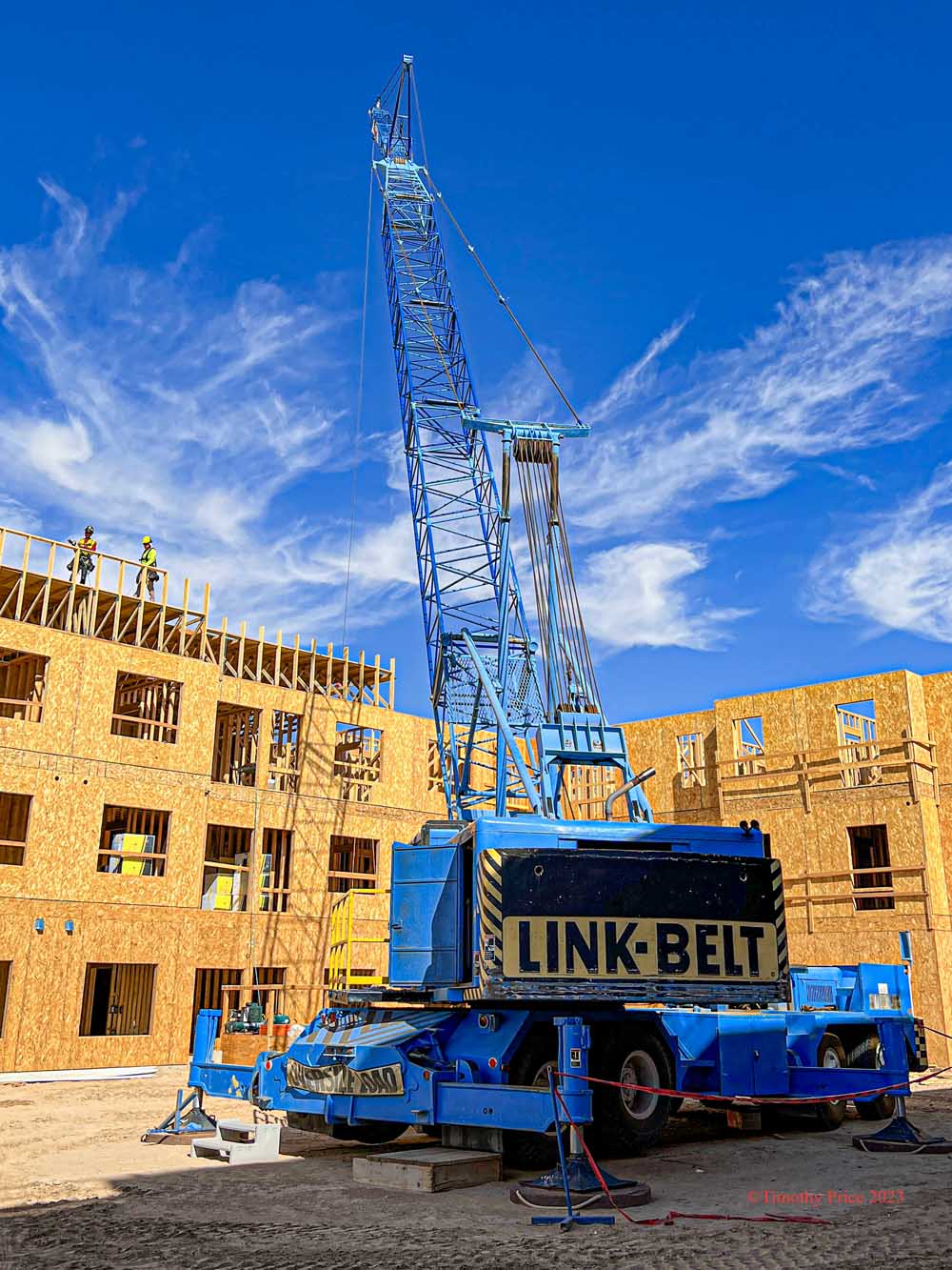 Gino called me first thing this morning to see if I could go out and film Mr. Williams operating a large Link-Belt crane that few people in the city know how to operate at a construction site on Albuquerque’s west side. I drove over and took video and photographs for a couple of hours and compressed the video footage into a three-and-a-half-minute video of Mr. Williams hoisting trusses up onto the roof of the building under construction. The framing contractor is Nelson Framing. Jerry Nelson, the owner, and Gino have worked together on many projects. The building contractor is Bradbury Stamm Construction. The Superintendent of the construction site was kind enough to lend me a hard hat and vest to wear. Nelson’s staff working with Mr. Williams on the ground and on the roof came over and introduced themselves before they started hoisting trusses.