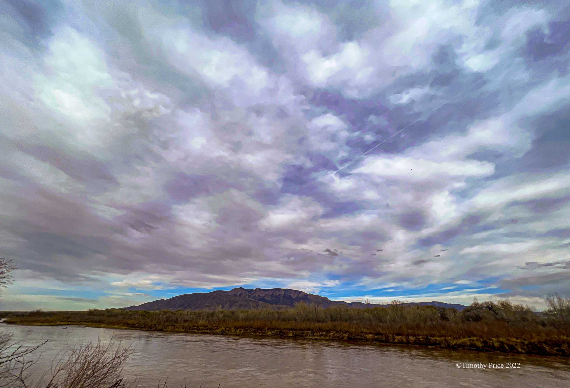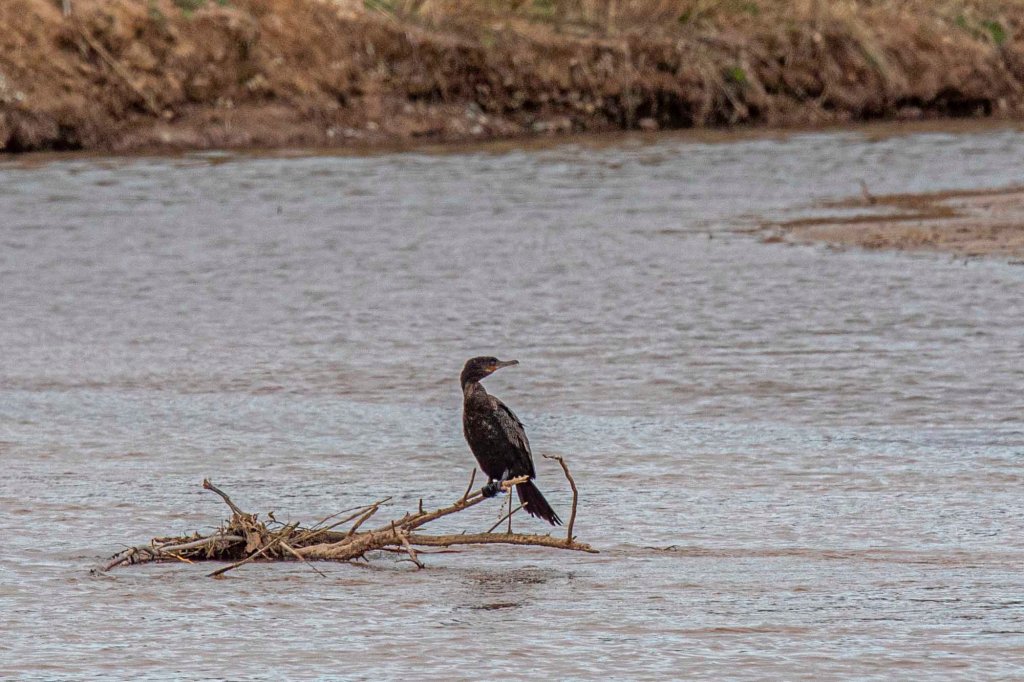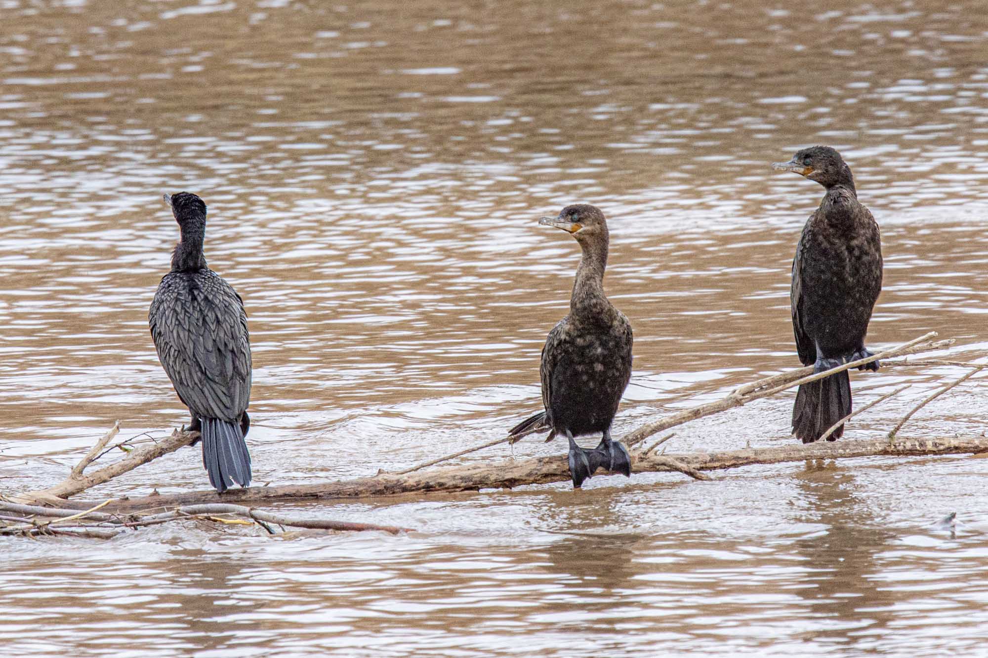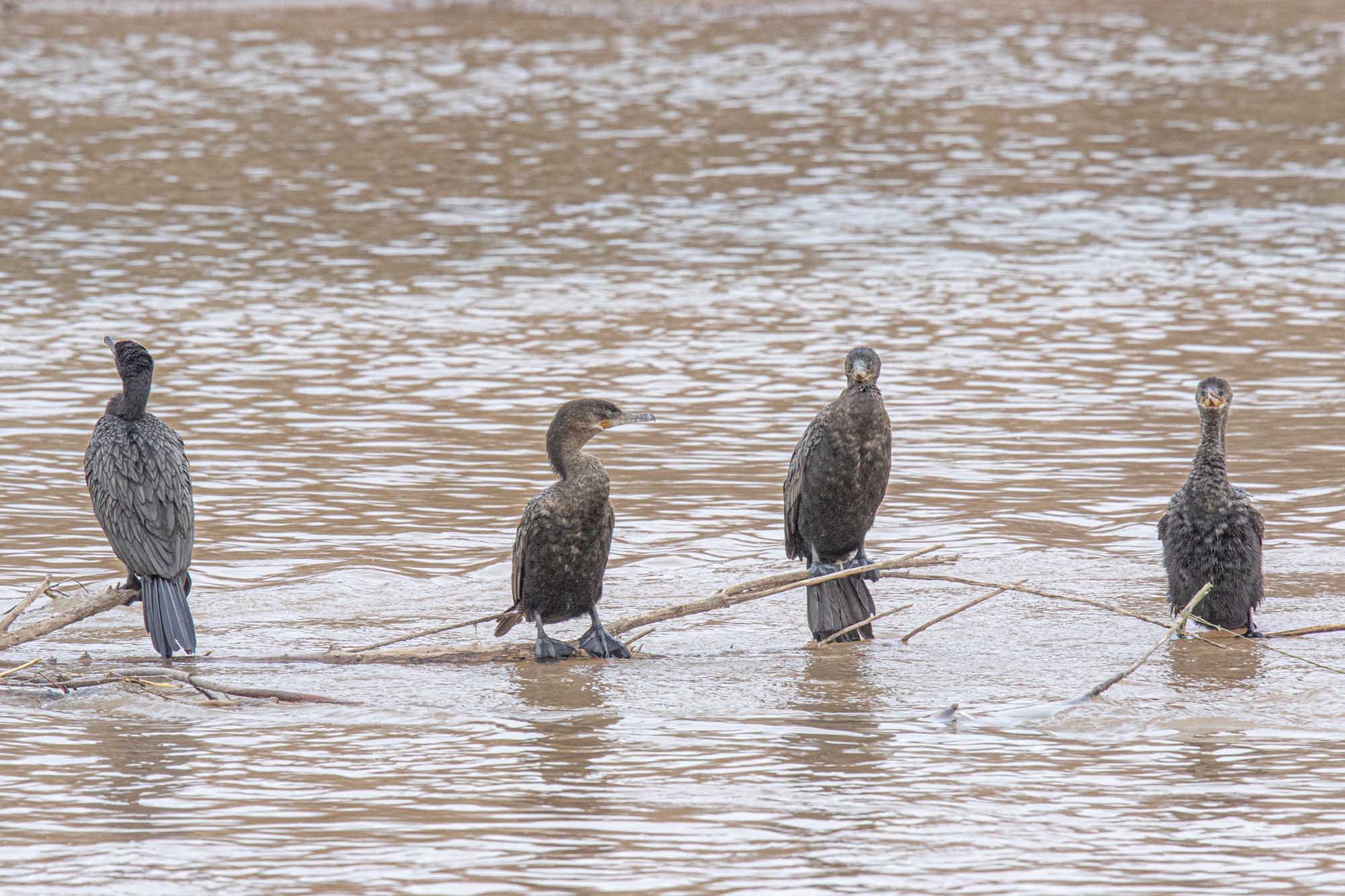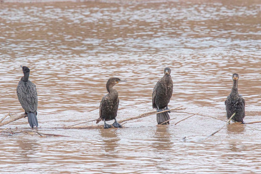 Four Cormorants on a log in the Rio Grande as seen from the Beach.