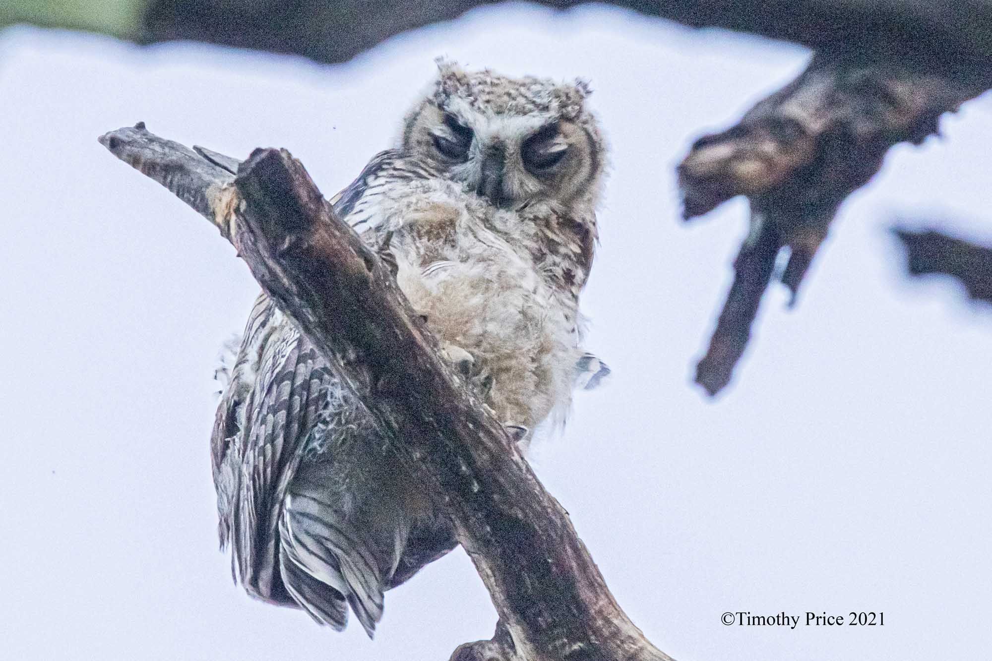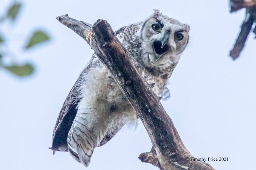 Paul flew over to the trees between the ditches leaving Mary behind. Daddy owl was keeping an eye on Mary. We didn’t see Peter in the trees between the ditches, so we presume he flew over to the Bosque. We’ll have to go over and see if we can find him in the Bosque. Given the rate of growth and flying, the owlets might have each hatched a week apart.