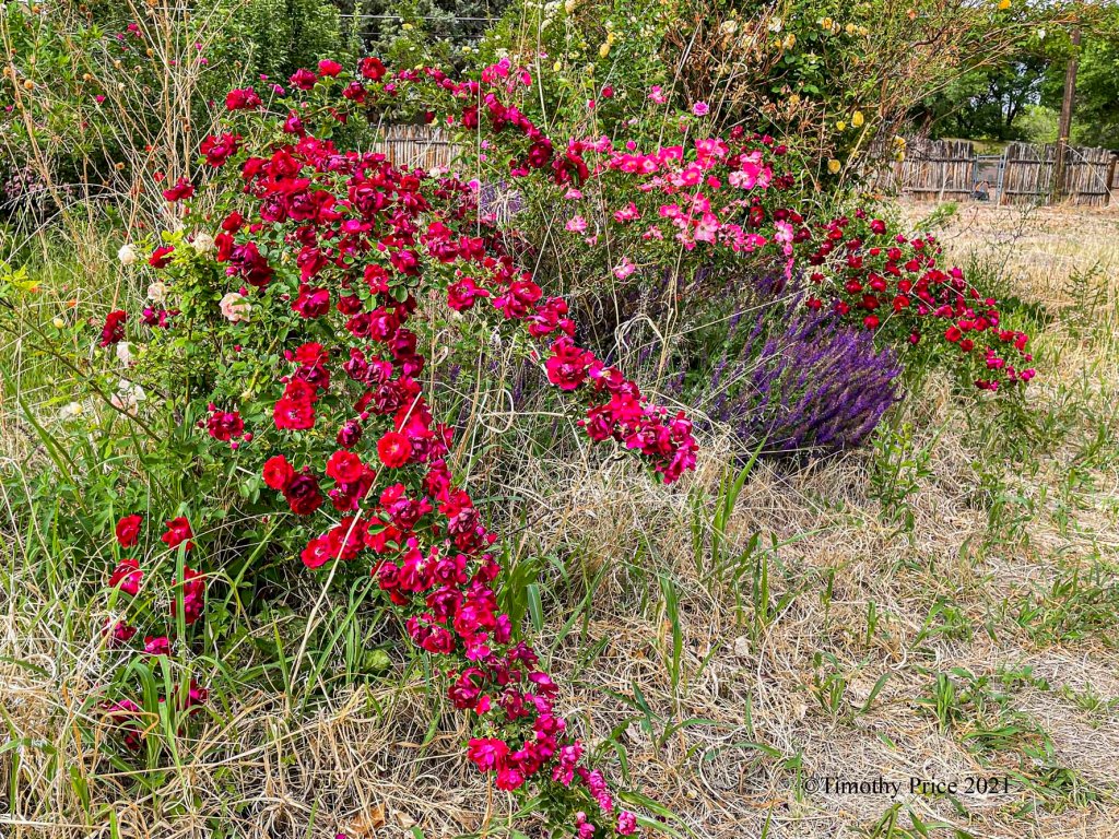 Most rosarians don’t like Dr. Huey, but Laurie, Susan, and I love Dr. Huey. It only blooms once, but when Dr. Huey blooms it produces a lot of beautiful red roses with yellow centers. While many of our other roses are struggling due to the drought, Dr. Huey is thriving. Rosarians who live in other parts of the country that don’t have harsh climates like New Mexico can be snobs and hate rootstock roses, but Laurie, Susan, and I appreciate any rose that can thrive in New Mexico, and Dr. Huey is thriving.