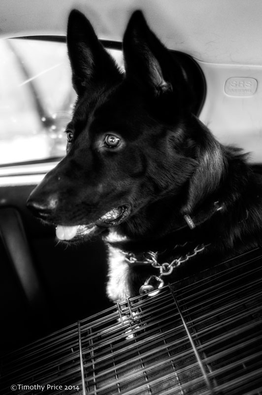 Since we had the newly acquired RX-8 in the shop for service, I took Tristan to the Heights to pick up Diesel, who she is dog sitting for a friend. I put Diesel, his crate, dishes, blankets and toys in my RX-8, which where a rather tight fit, and drove him to Tristan’s. Diesel is a very well behaved, black German Shepard, who enjoyed his rather cramped ride across town. He even gave me a wink over the thought of putting Diesel in the RX-8.
