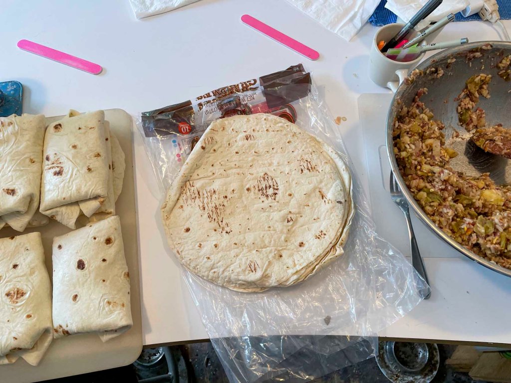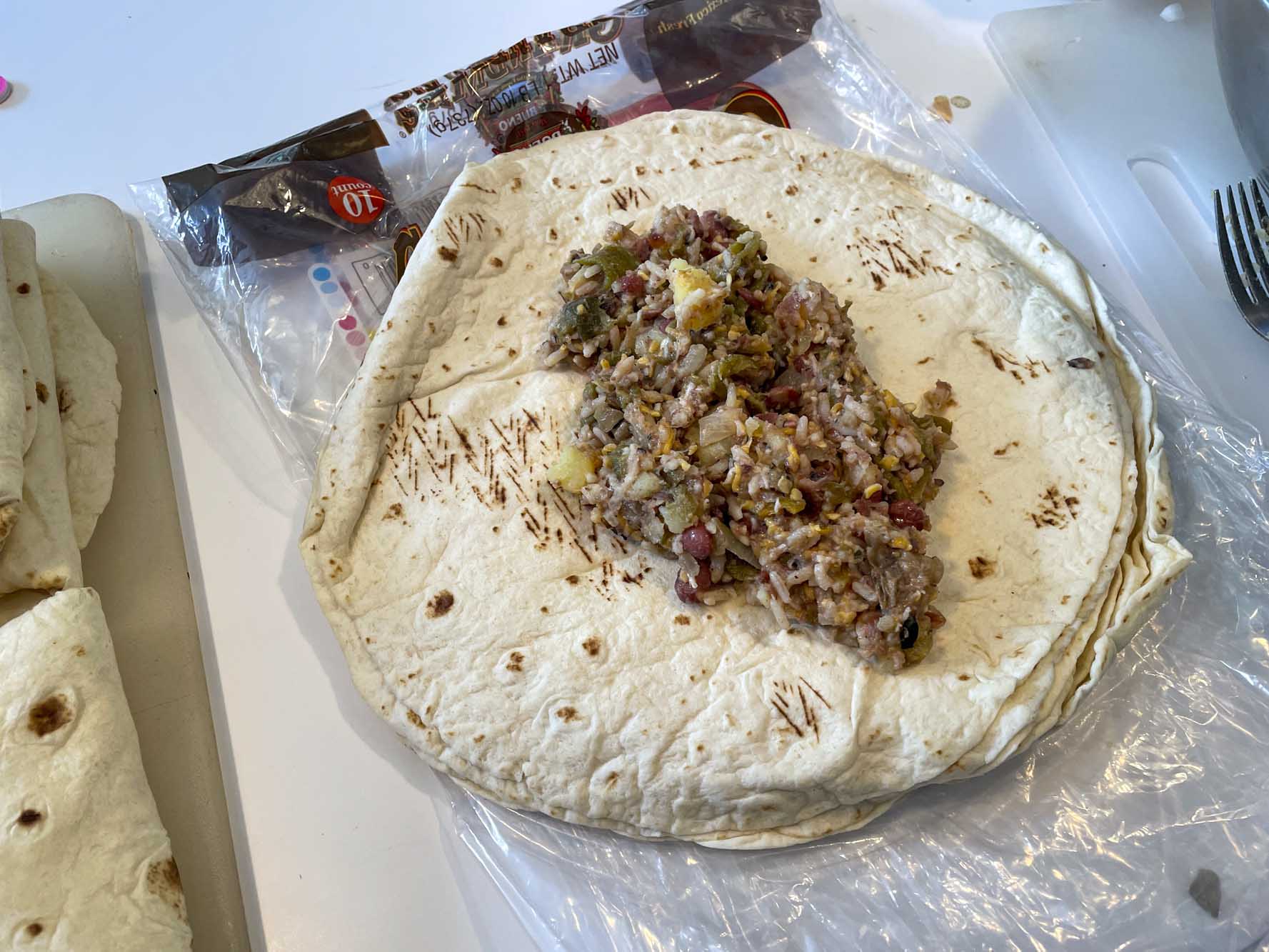 Mix the cooked pinto beans, rice, chunked potatoes, sautéed onions, spices and green chiles in a large mixing bowl and stir everything together until the ingredients are evenly mixed. I mixed the shredded cheese in with the other ingredients. The cheese is optional or it can be added on top of the mixture before wrapping the tortillas. Spoon the mixture onto a tortilla or wrap. Fold the short ends first and then the long ends.