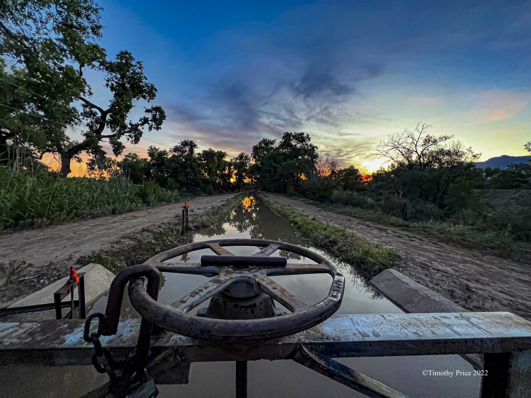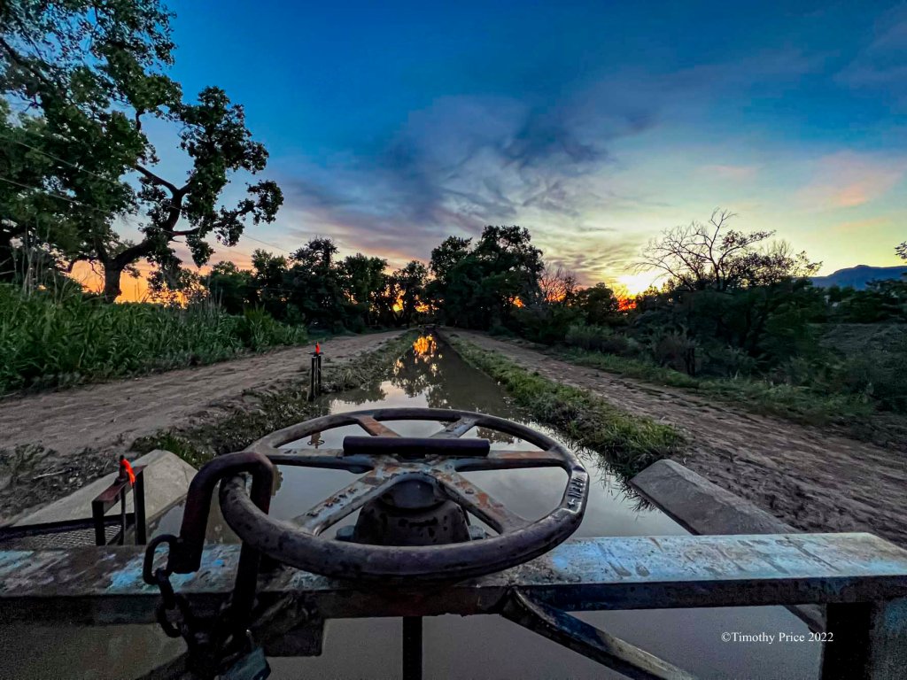 I got water for my first irrigation tonight. It’s so dry the land soaks up the water for a long time before it keeps flowing. Furthermore, the water level in the acequia madre keeps fluctuating, which changes the water pressure. Between bone dry land and changing water pressure, it’s going to take a long time to get everything watered tonight. I may not get everything watered tonight.