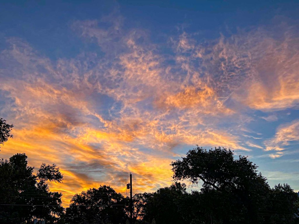 Sky burns red through trees
