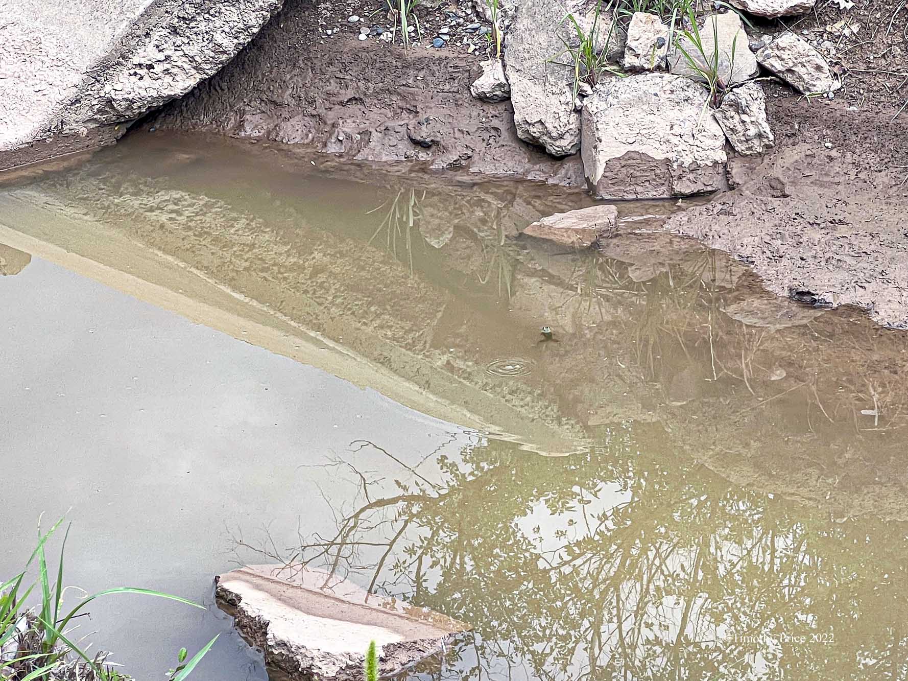 I irrigated this morning. When I went out to let in the water at 5:30 am, there was a bullfrog at the gate. The temperature was 45º F (7.2º C) and Mr. Frog stood his water and held tight even though the gate made a lot of squeaking noises as I cranked it open, and the current from the water rushing into the culvert tugged at his buoyant body.