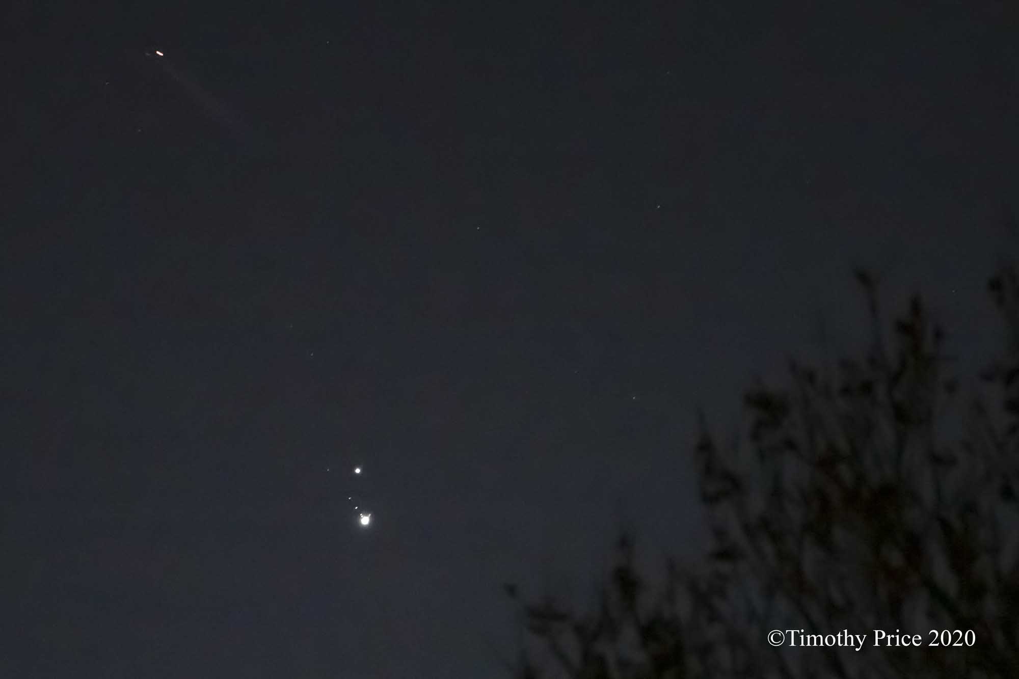 A closer view of Saturn and Jupiter at 6:00 pm. The lights coming off at an angle from Jupiter might be a few of its 79 moons.