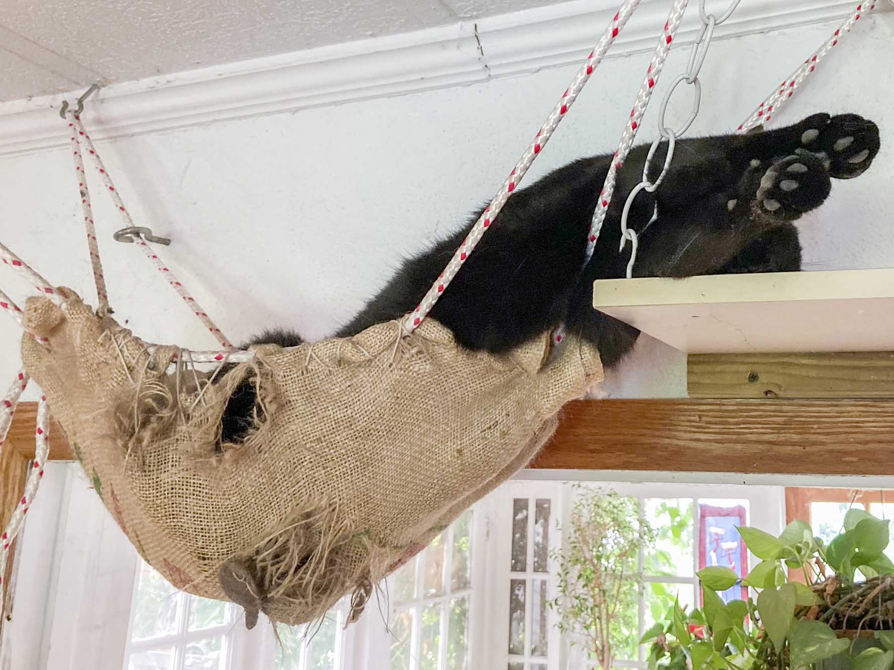 Spunk in the fuzzy hammock I replaced the last burlap hammock with.