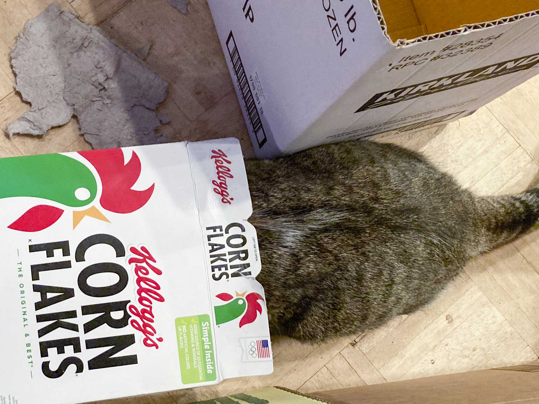 Glenda and Morgana are having a ball playing in and around all the boxes and fabric under our bed. They played on Laurie and me and attacked us for about an hour after we went to bed last night. They would come up and snuggle and purr for a few seconds and then go back to playing. Each one has a distinctive purr. They finally settled in and slept on us for a couple of hours before they moved to a box under the bed that’s full of fabric they like to curl up in and sleep together.