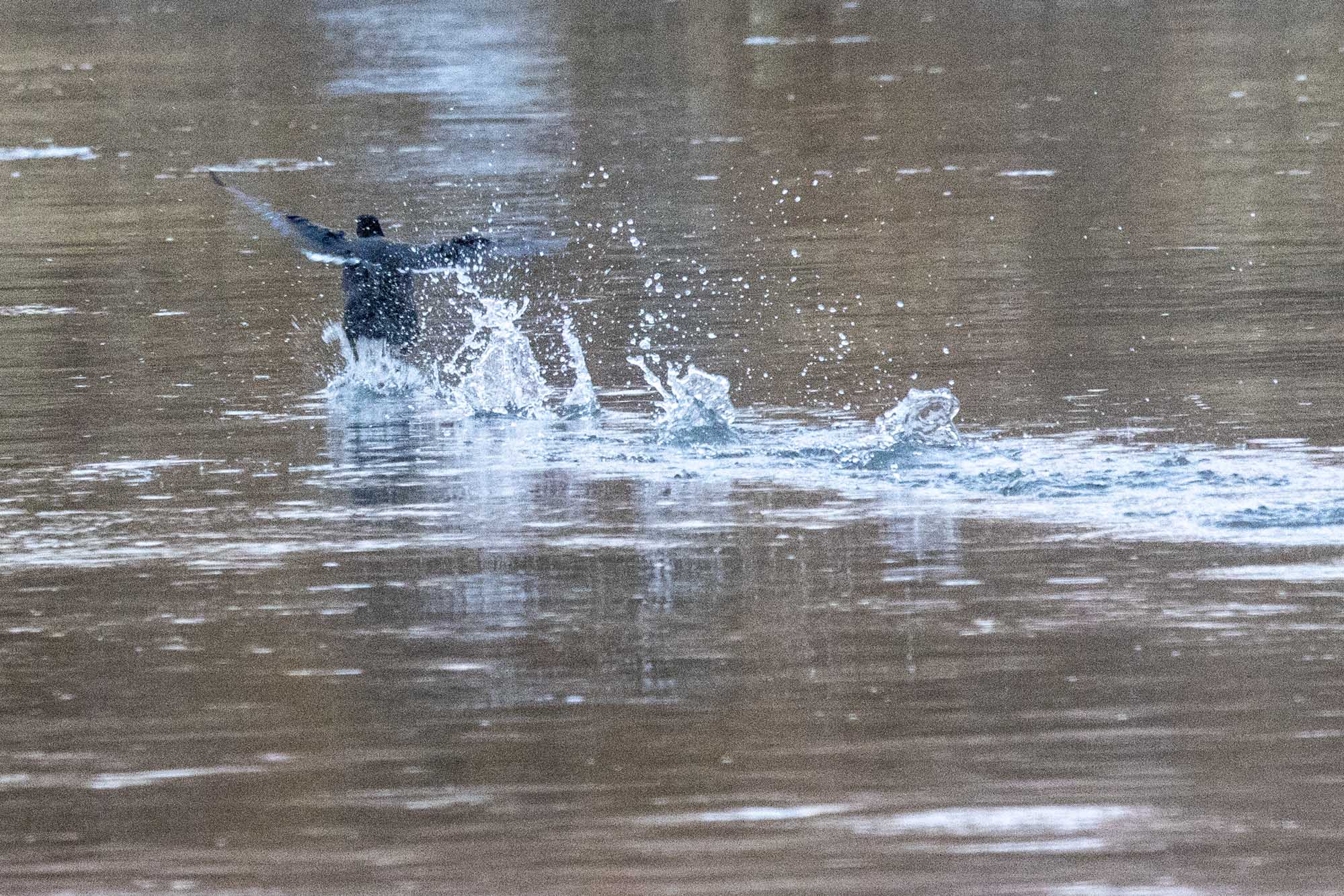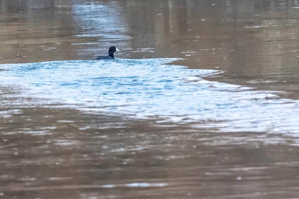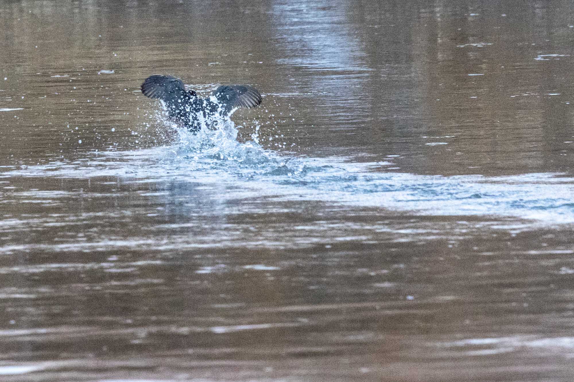 This American Coot was foraging on the sandbar. Then it started to take flight and decided against it.