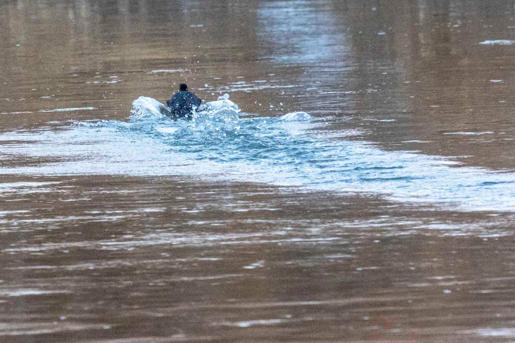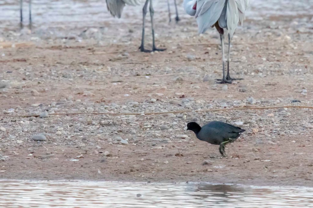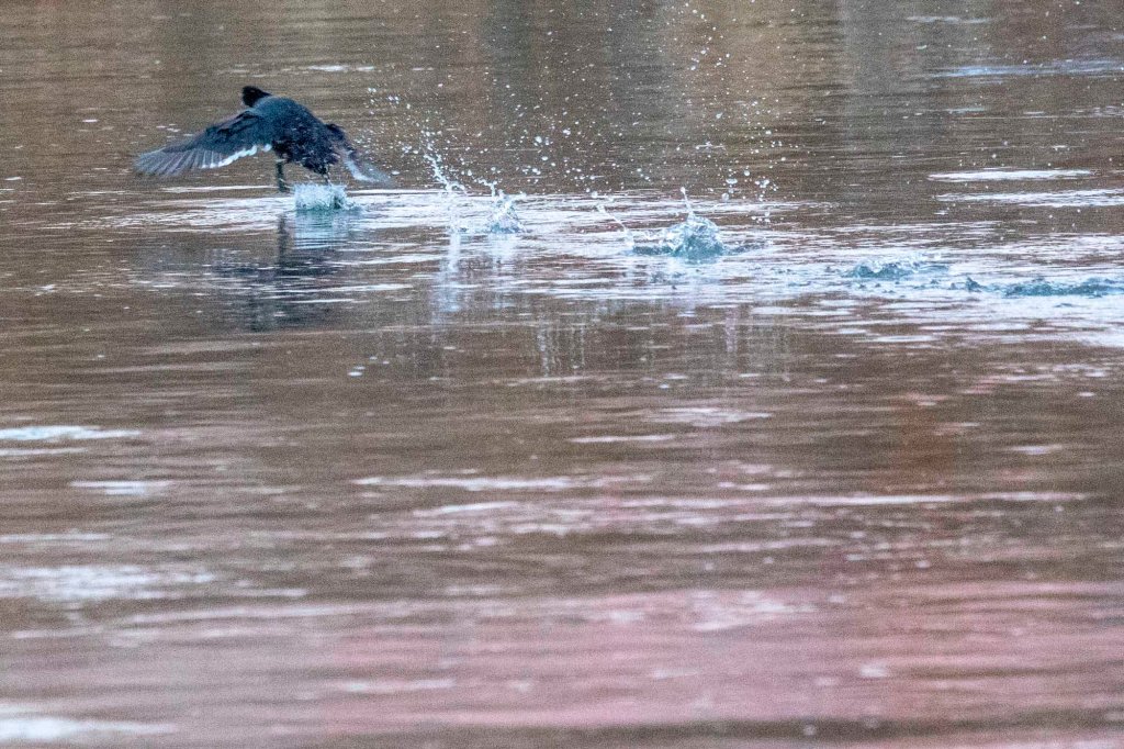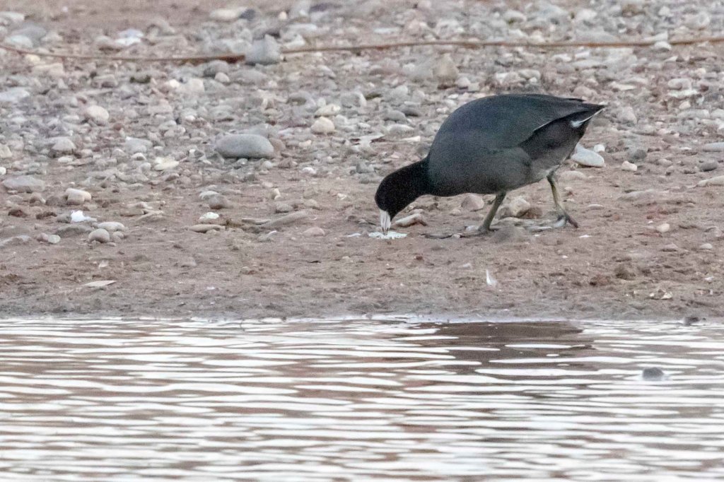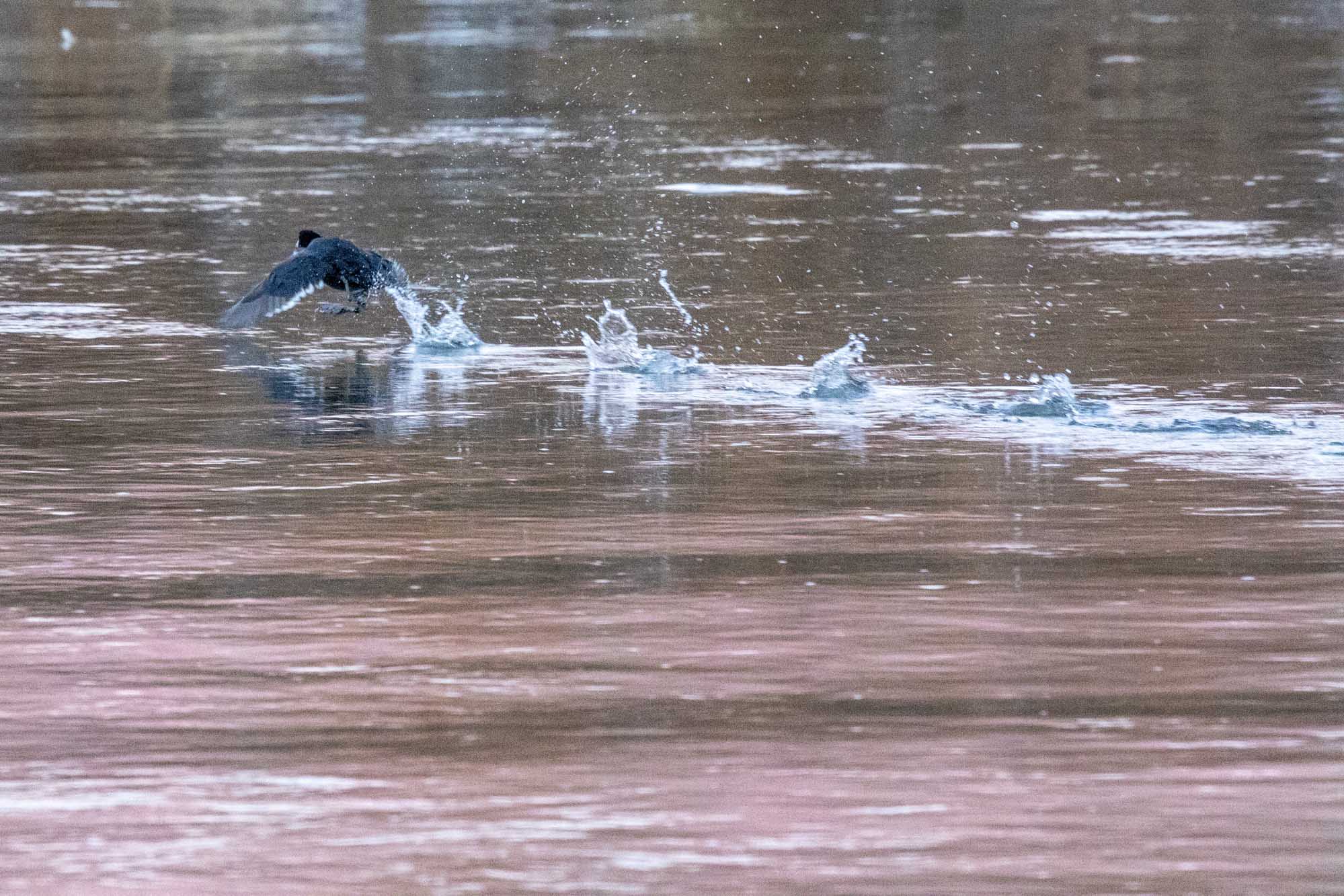 This American Coot was foraging on the sandbar. Then it started to take flight and decided against it.