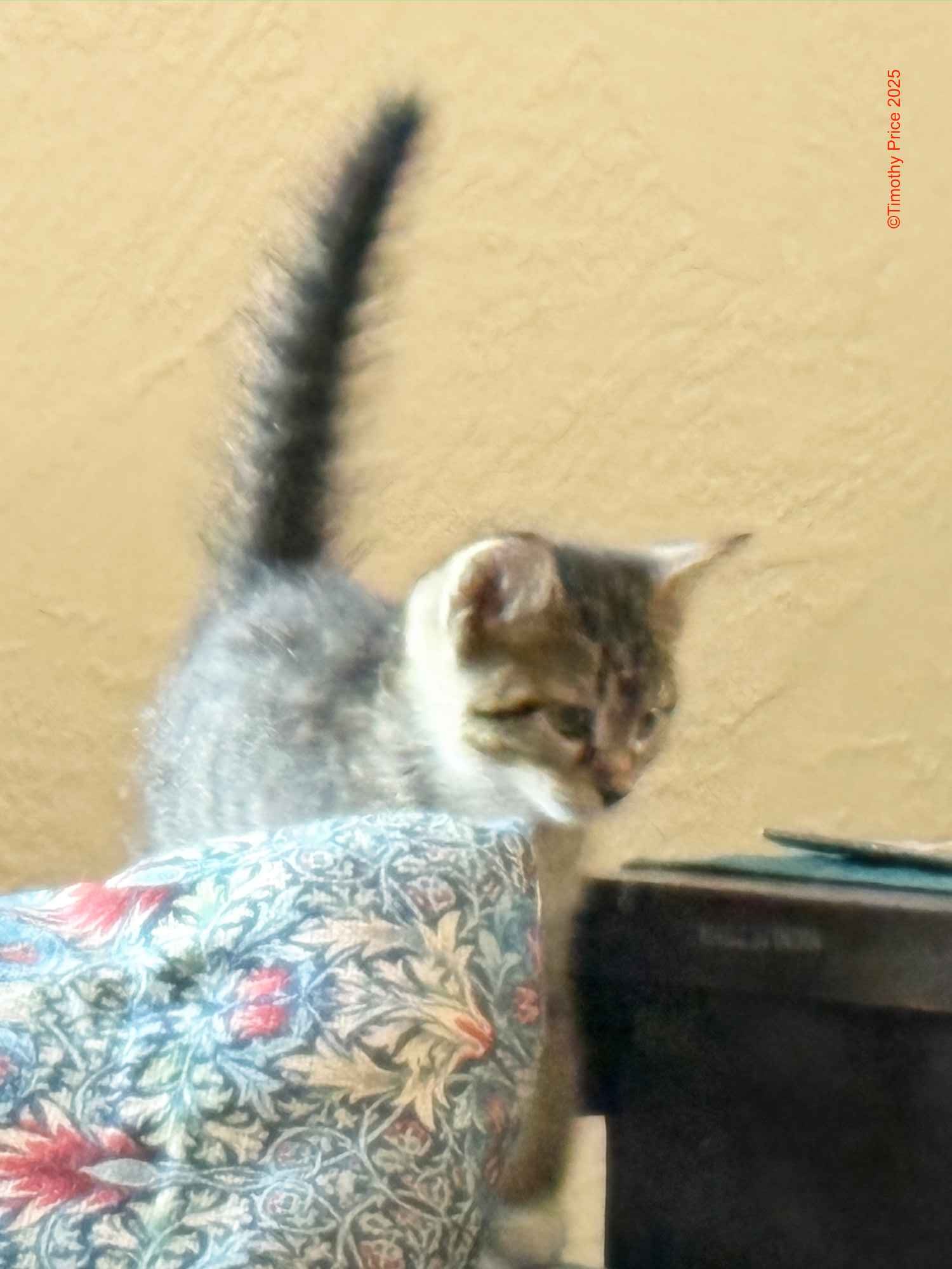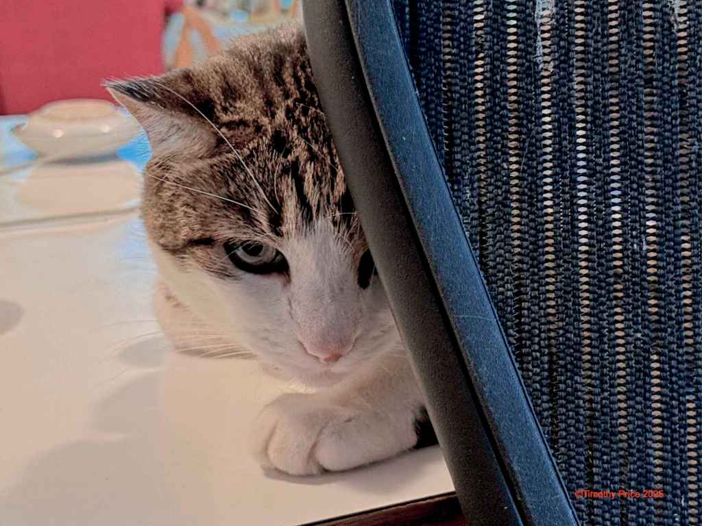 After helping me change the sheets on the bed, Diné started challenging Rosencrantz by biting him on the legs. I ran and got my camera, and when I returned Rosencrantz was giving Diné “mad dogs”, and the fight was on. Diné is the one who picks fights with Rosencrantz and Guildenstern and she is always on top as the aggressor, because even though Rosencrantz and Guildenstern are both much larger and stronger than Diné, she is still top cat; therefore, they always maintain the defensive position when she attacks. Even though Rosencrantz brandishes his impressive set of claws in Diné’s face (those claws have earned him the nick name “Claws and Fangs”), Diné is not impressed and whoops on Rosnecrantz until she feels she’s defeated him. This is the full sequence of their sparring match from mad dogs to Rosencrantz’ attempt to get in one last swat before Diné jumped off the bed after her triumphant, tiger-like pounce.