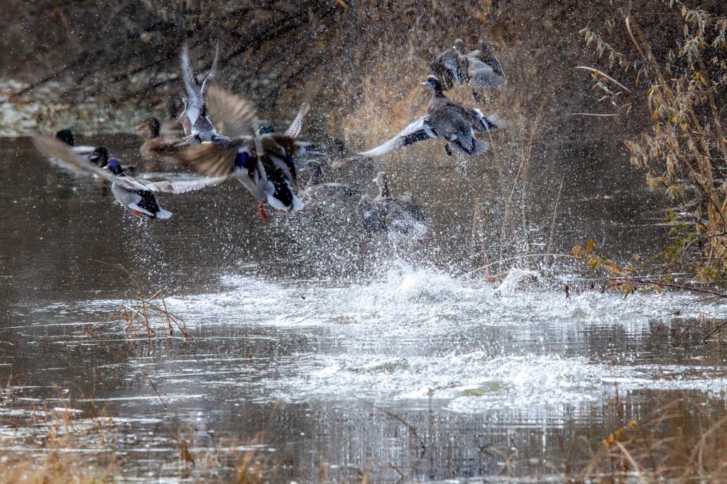 Mallards getting up to speed flying along the Rio Grande.