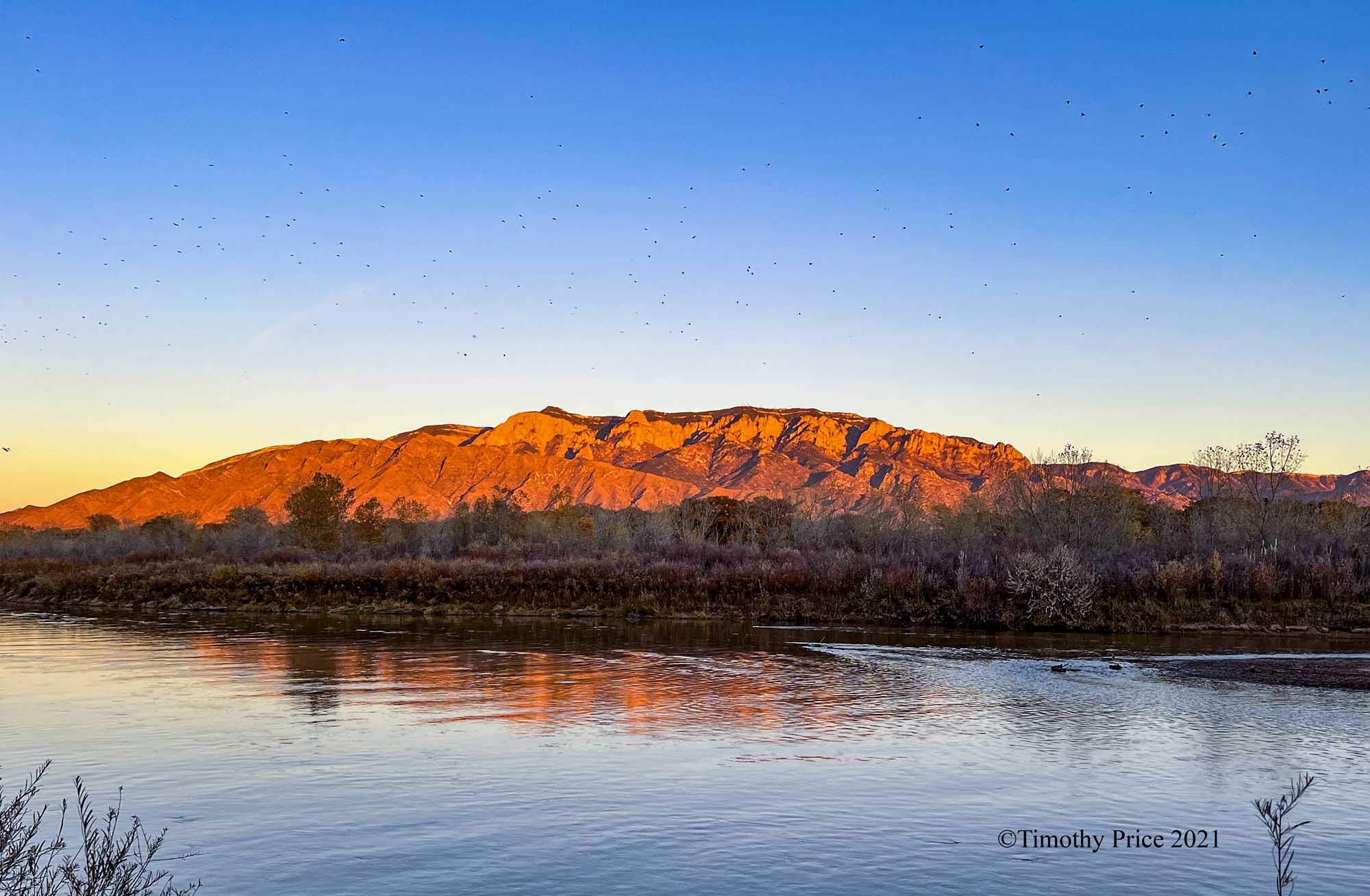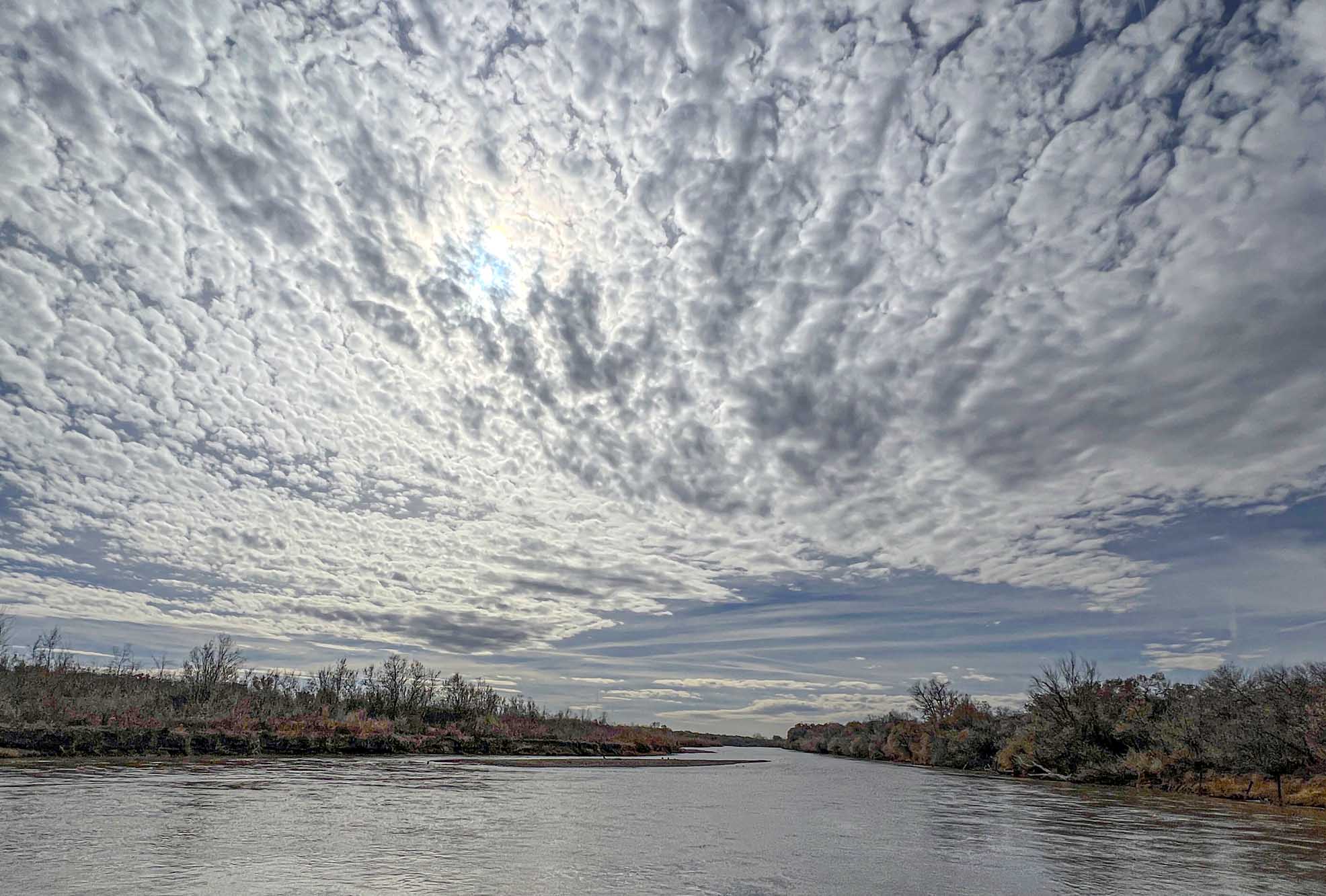The conservancy is let more water into the Rio Grande from upstream. That has brought the water level up in the Clearwater ditch. the black speckles in the sky are crows flying on the crow highway that follows the Rio Grande.