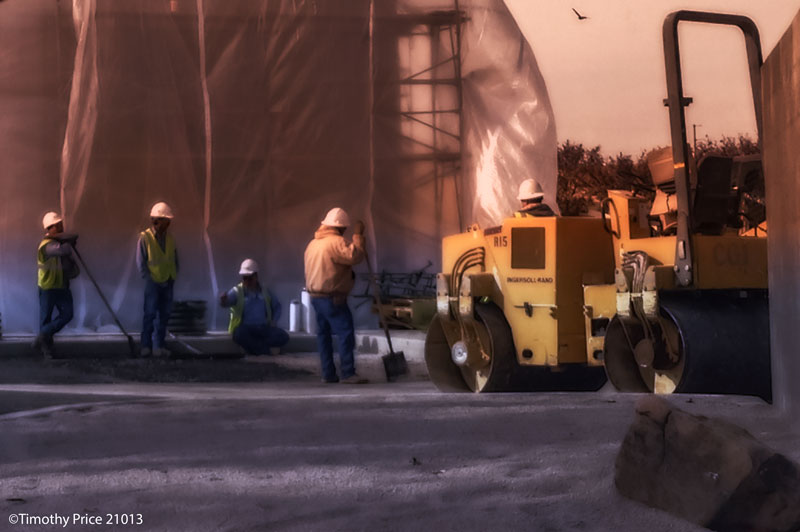 There is a stereotype of road workers standing around leaning on their shovels. While this photo reinforces the stereotype, I believe these guys are waiting for a fresh load of asphalt. I worked construction when I was young, and no matter what the stereotypes are, construction workers have hard jobs, and often have to work outside in bad weather this time of year. I remember digging footings and having to use a pickaxe to break up the frozen soil in single digit temperatures back in my days as a construction worker. I was young and stupid back then.