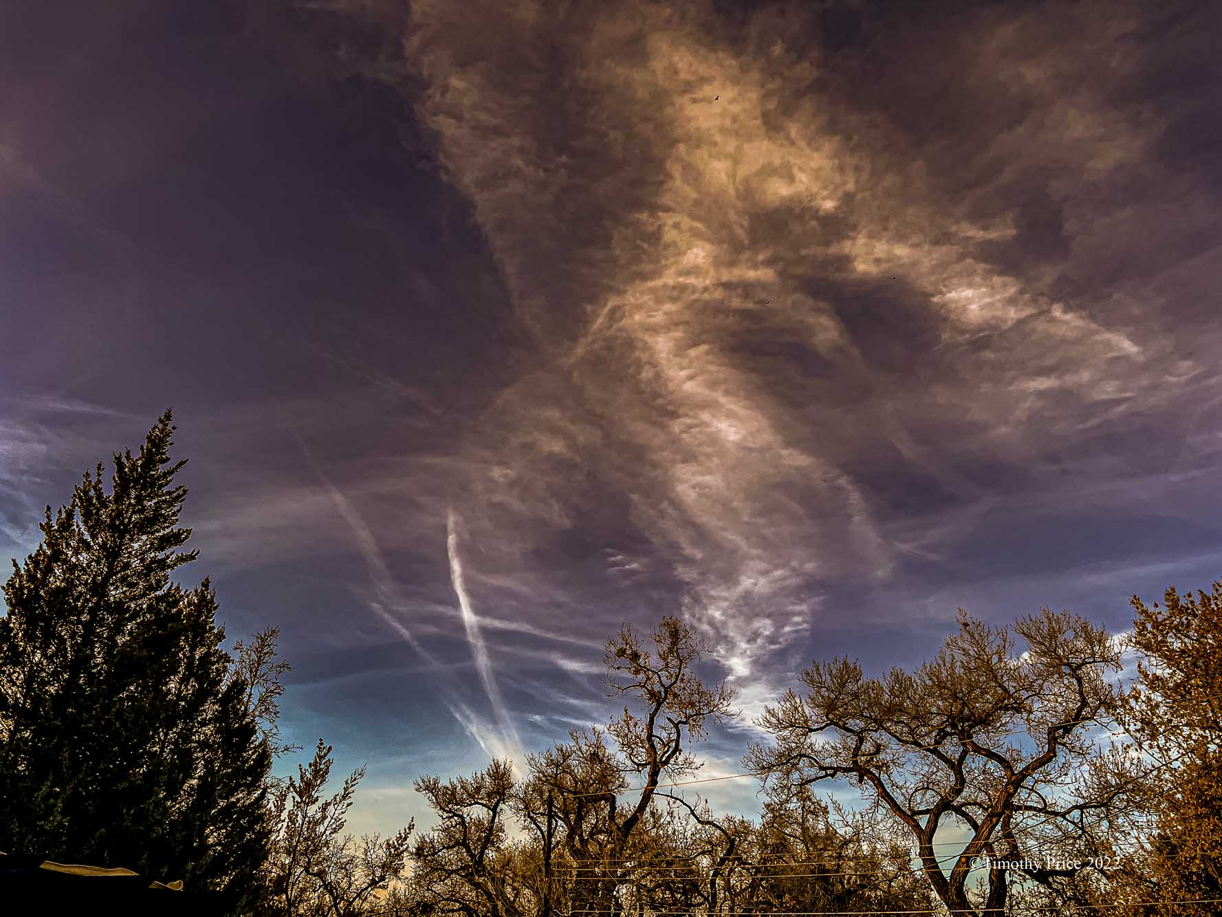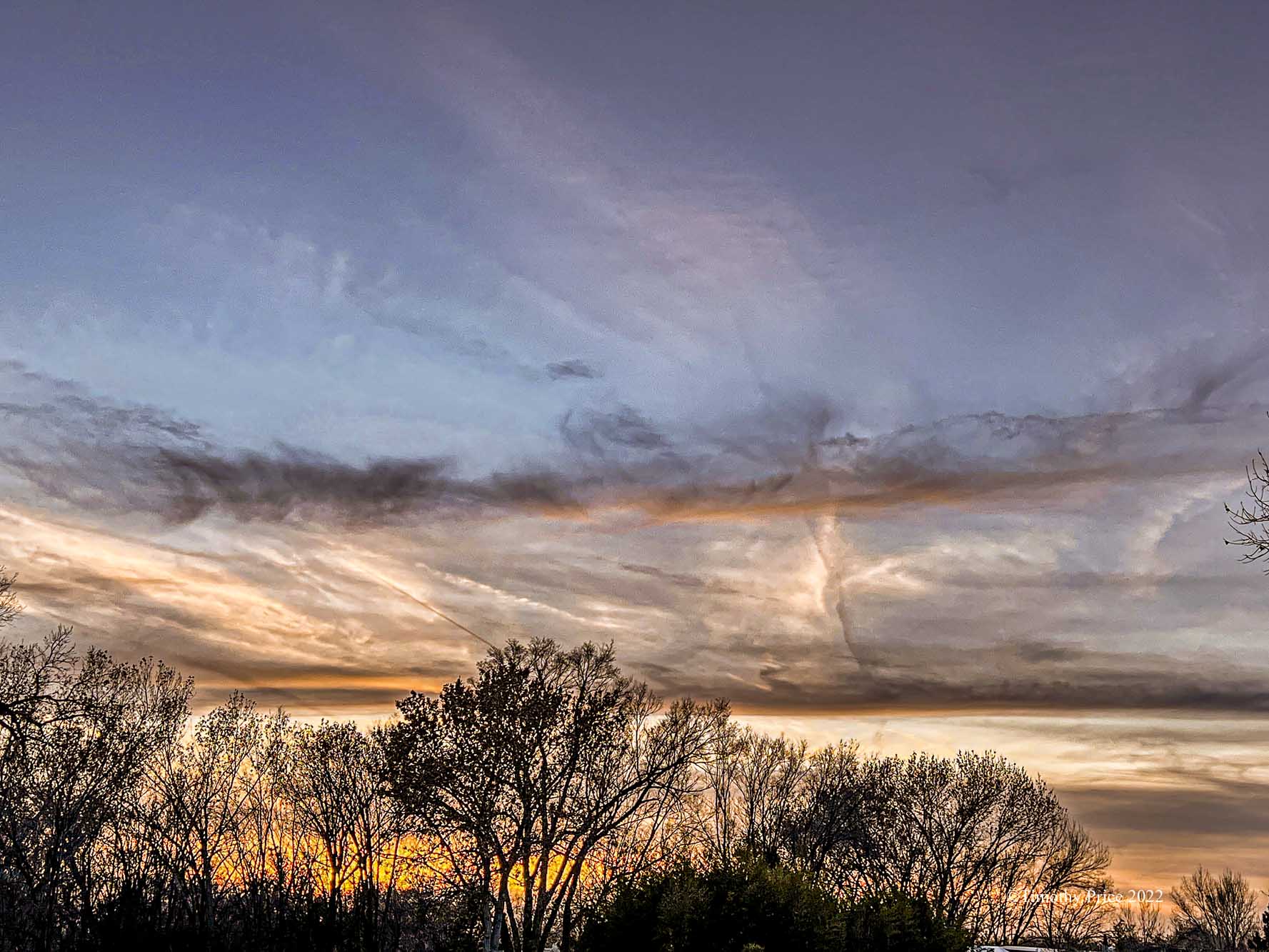I was thinking we were going to have a sky full of colorful clouds at sunset, but as the sun went down the clouds above the lines of clouds disappeared and most of the color was trapped under and between the lines of clouds.