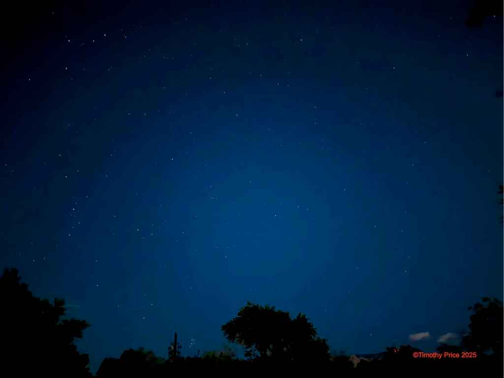Night sky at 2:00 am. The Pleiades is in the lower center and Mars is below the Pleiades. Click on the image to enlarge it.