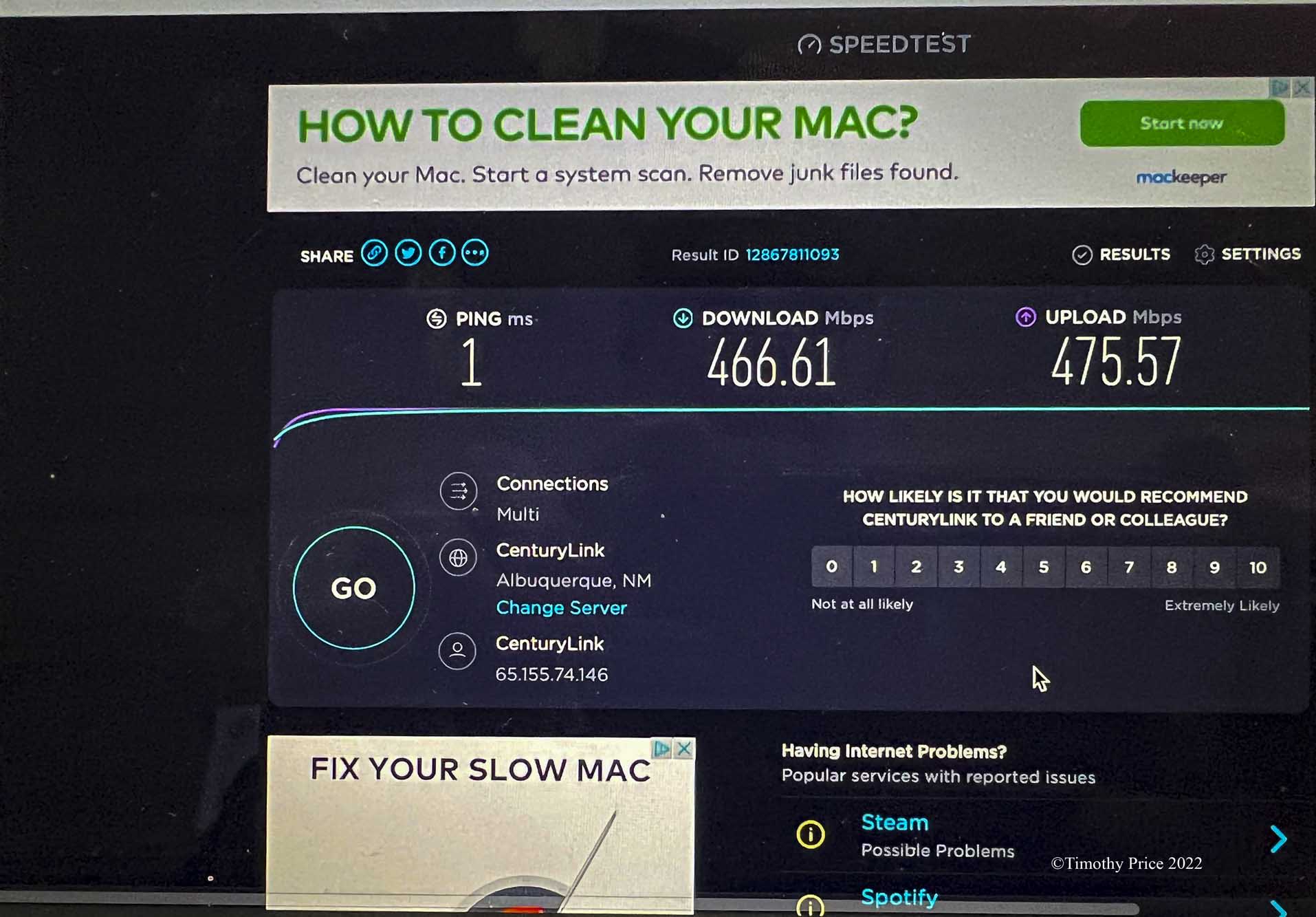 I got home very late tonight after helping the CenturyLink/Lumen tech get us connected to the fiber in our building and troubleshooting the upload speed. After two hours of troubleshooting, we got a good clock speed on Speed Test.