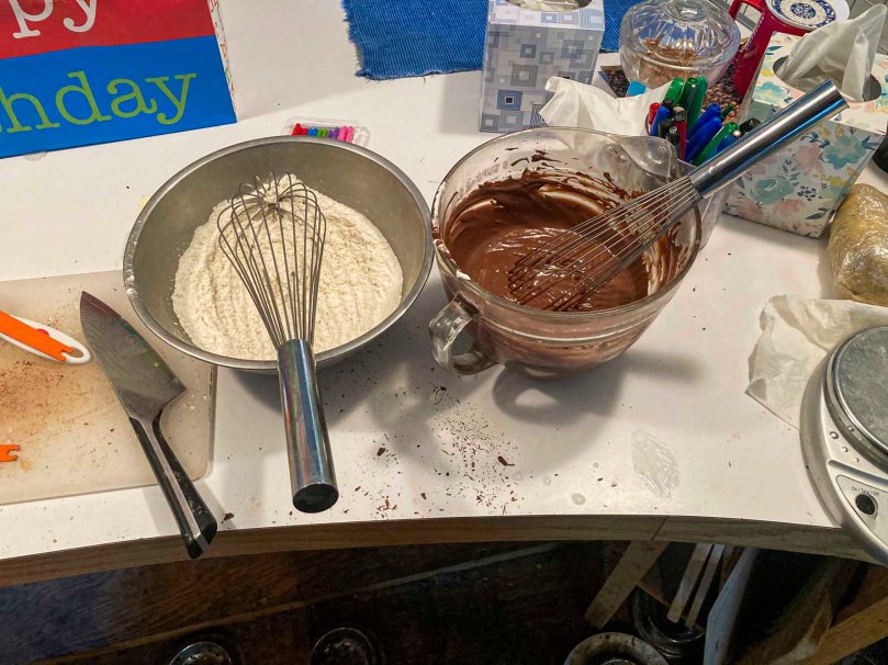 I prepped the flour while the chocolate mixture cooled so I could add sour cream to it.
