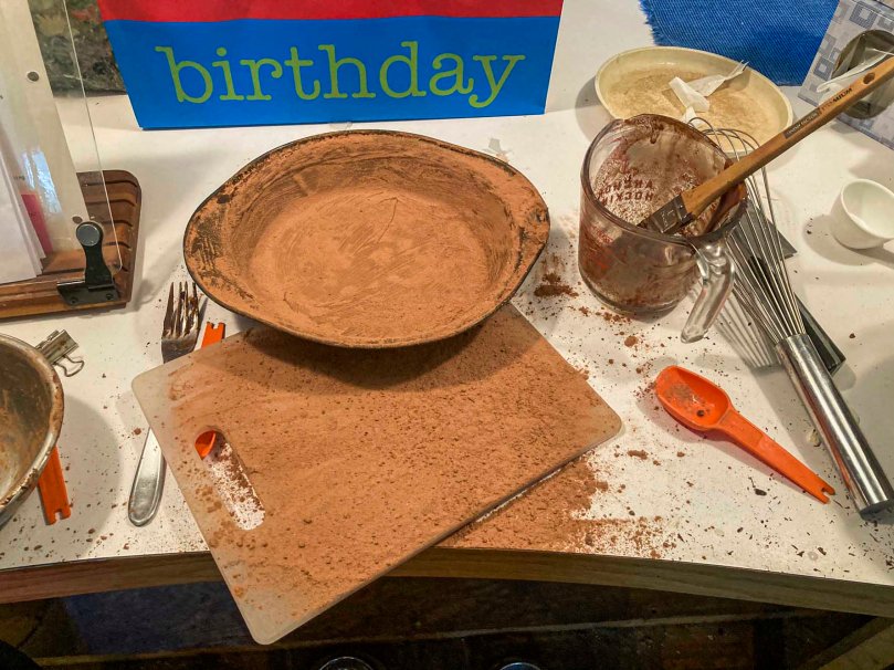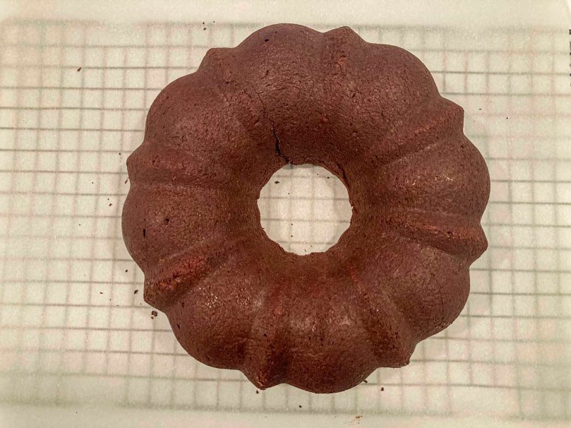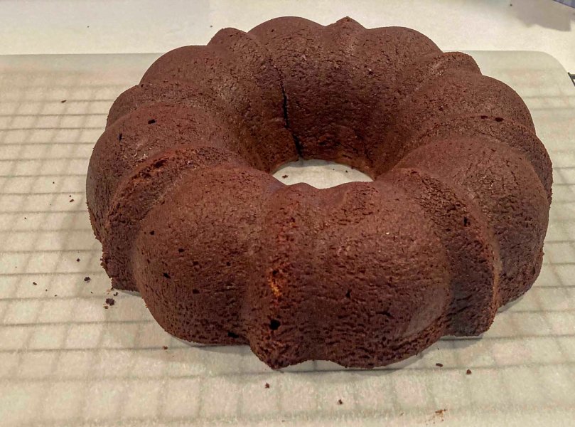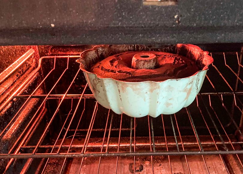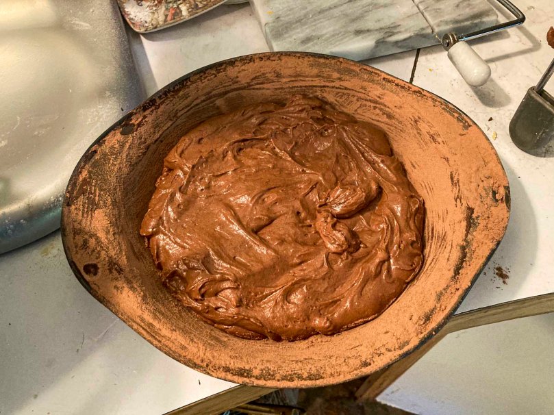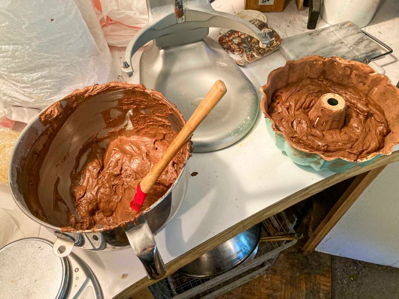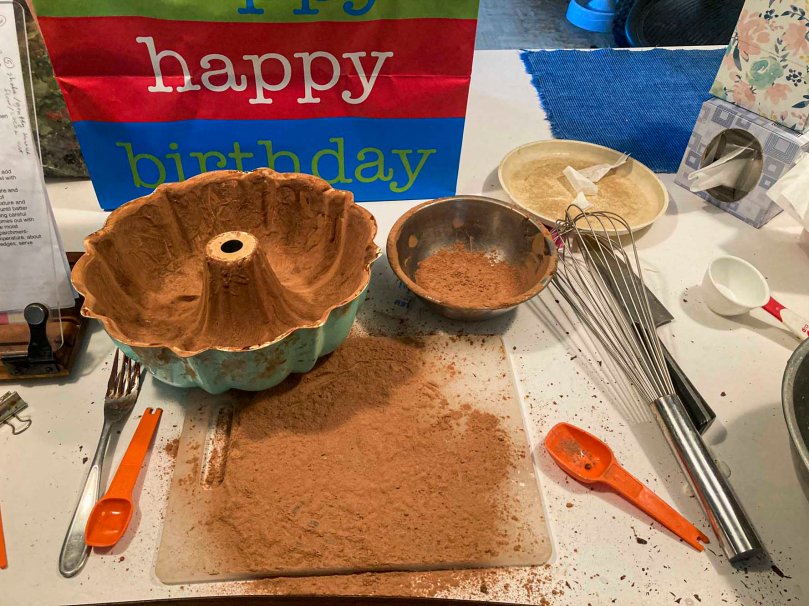 The recipe has you make a chocolate butter past to grease the bunt pan and then coat the pan with cocoa powder. Laurie said it worked better to use a mixture of cocoa powder and flour. Either way, I made a mess.