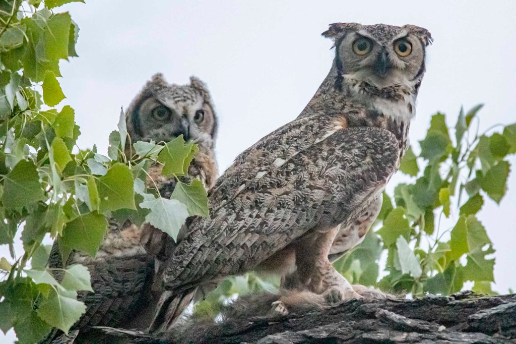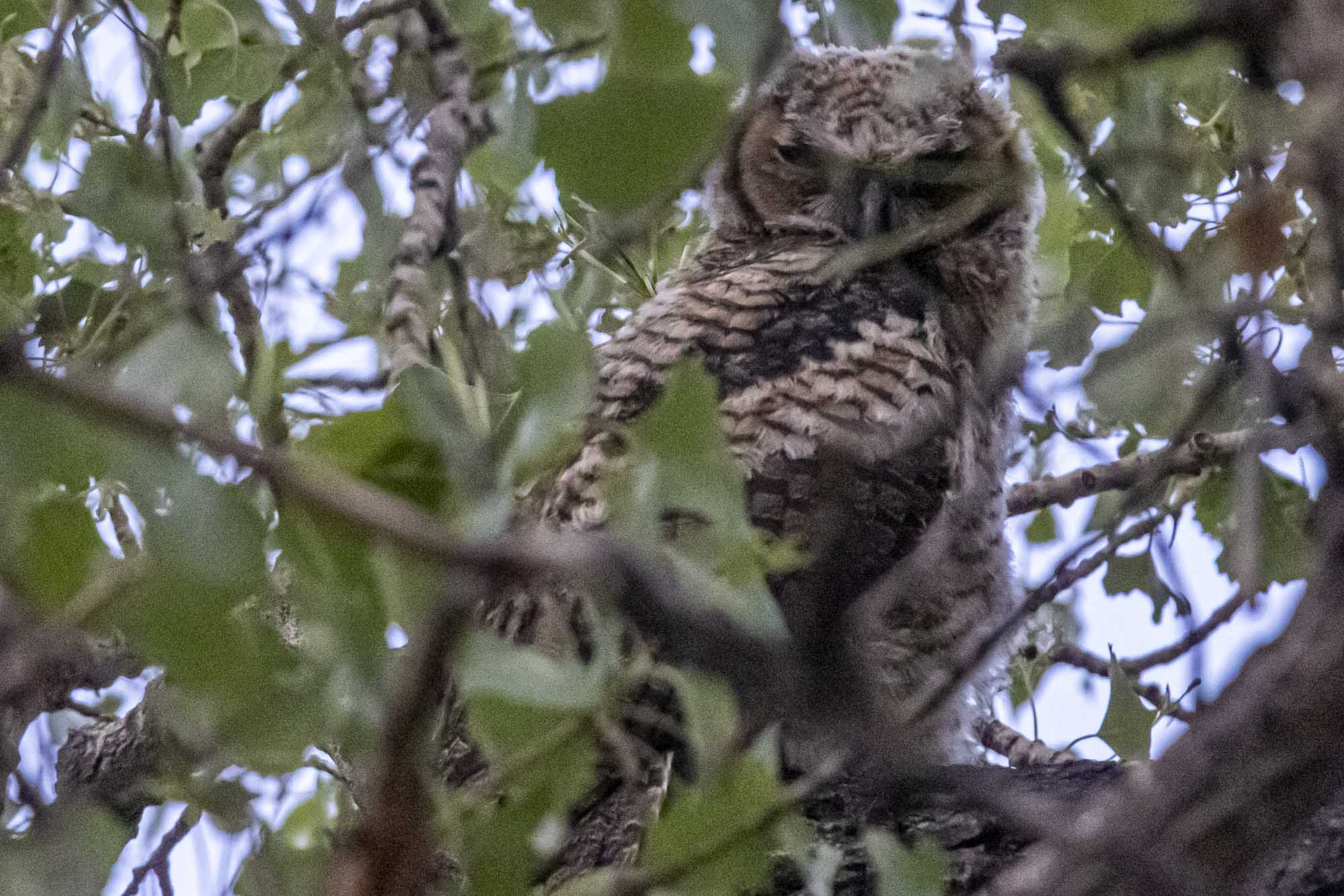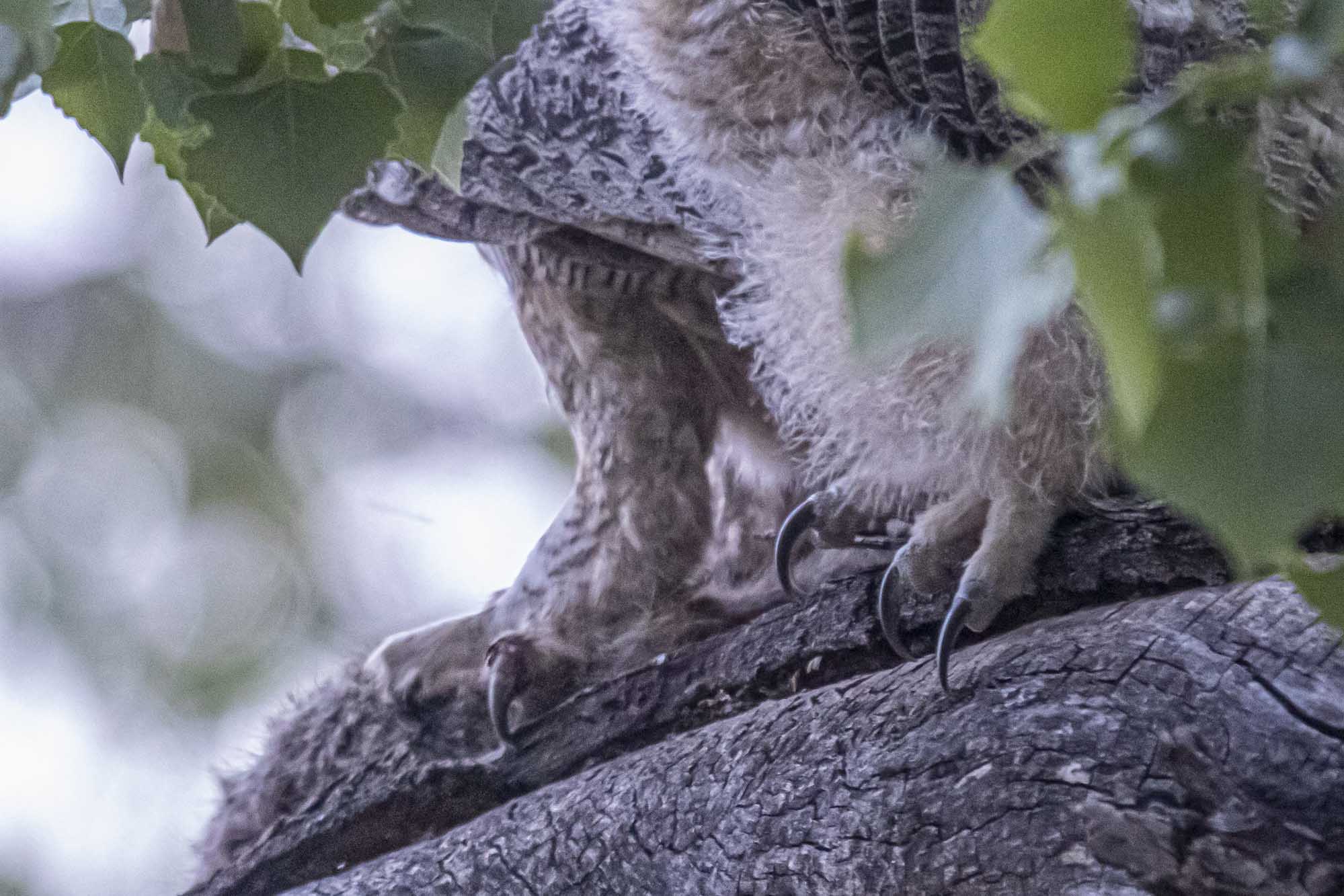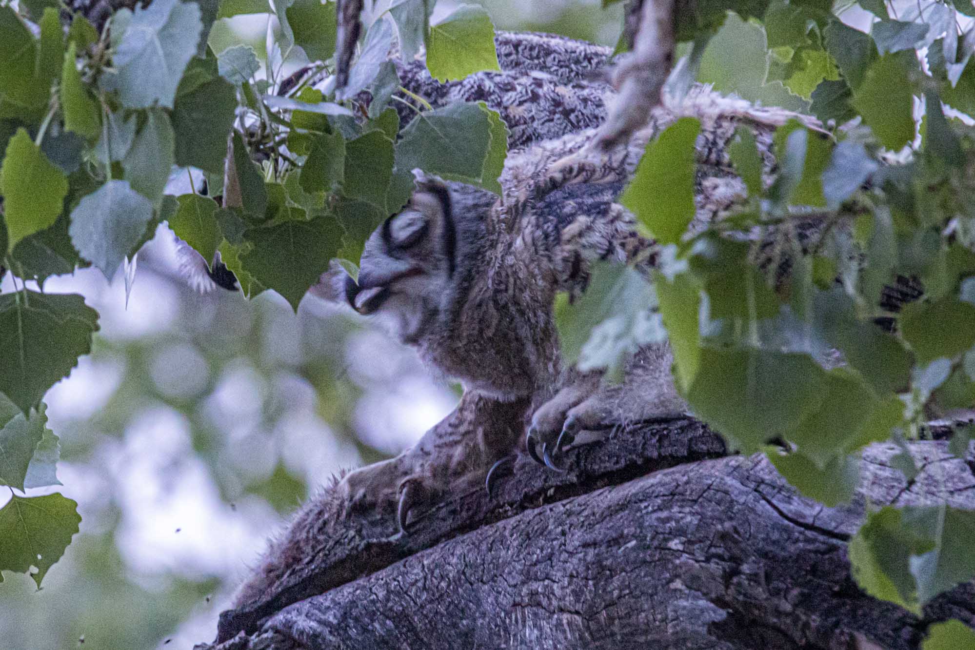 Mama Owl flew back and forth with food for the owlets three times while we were out with them last night. It was dusk, and she was giving the owlets their meals behind a mess of leaves, so I couldn’t get the exchanges of food, but Peter was proud of his mouse and acted like he had a mouse cigar in his beak for quite a while before he finally ate it.