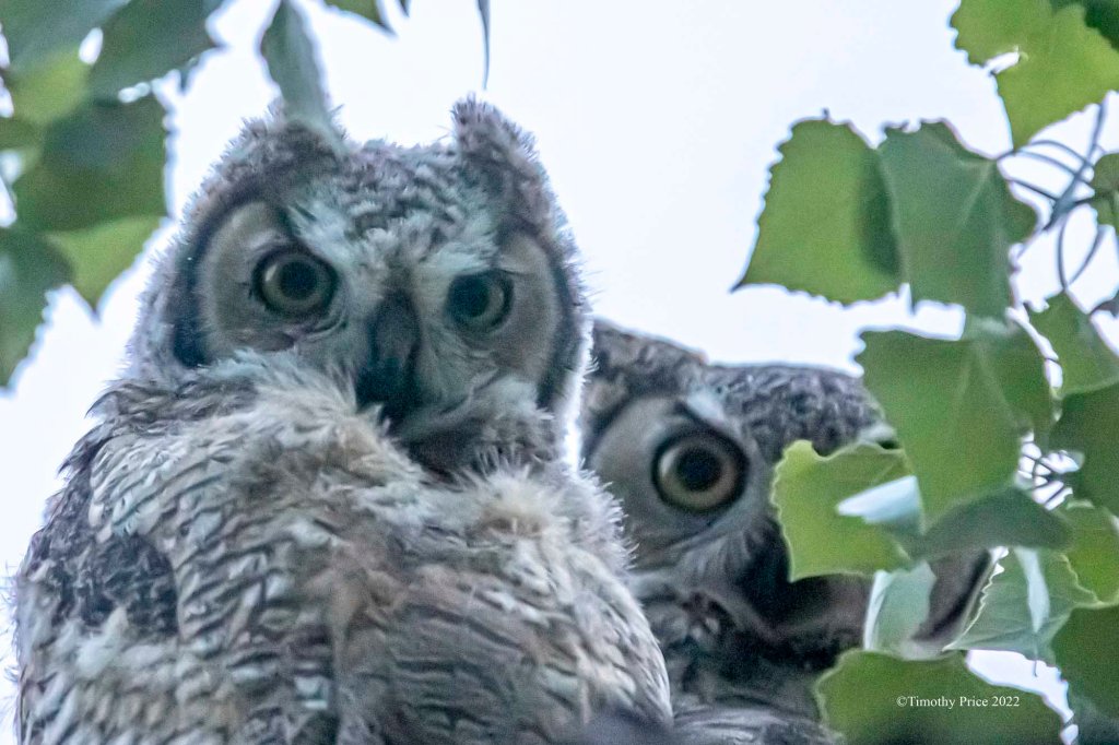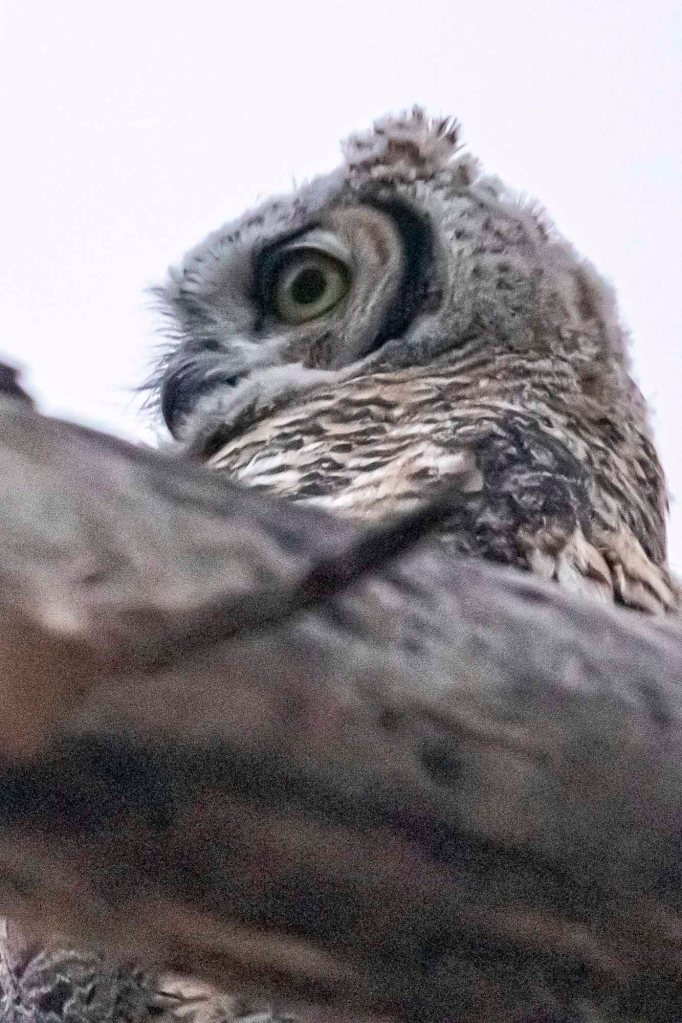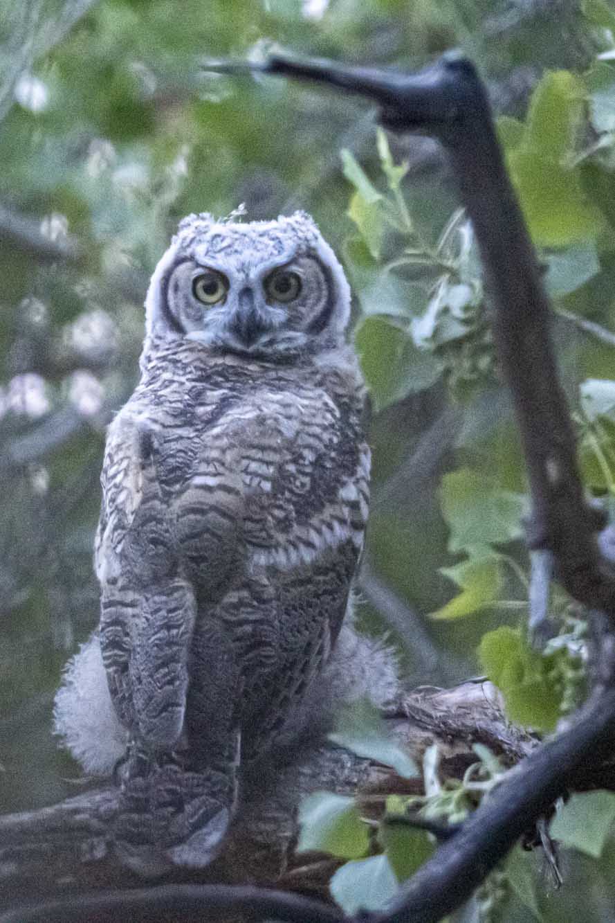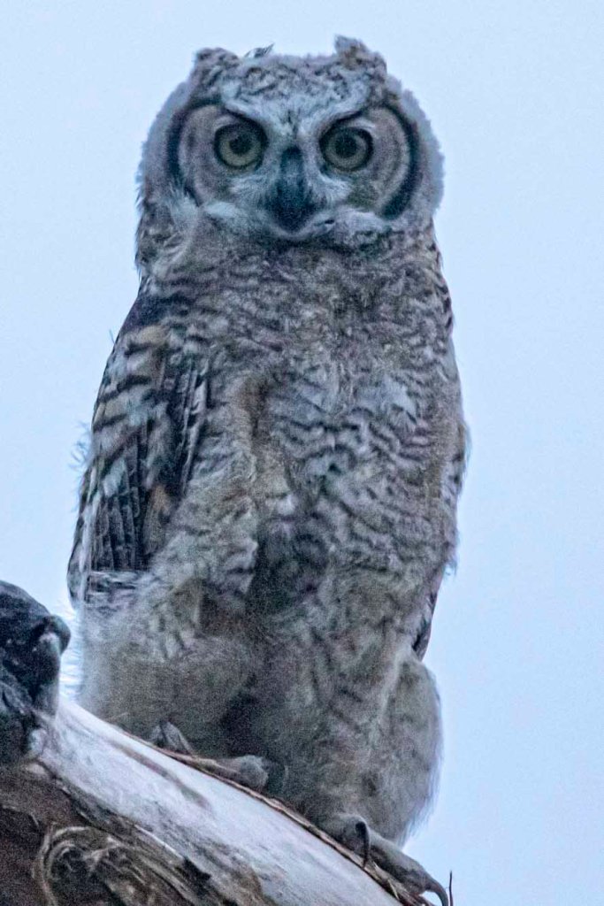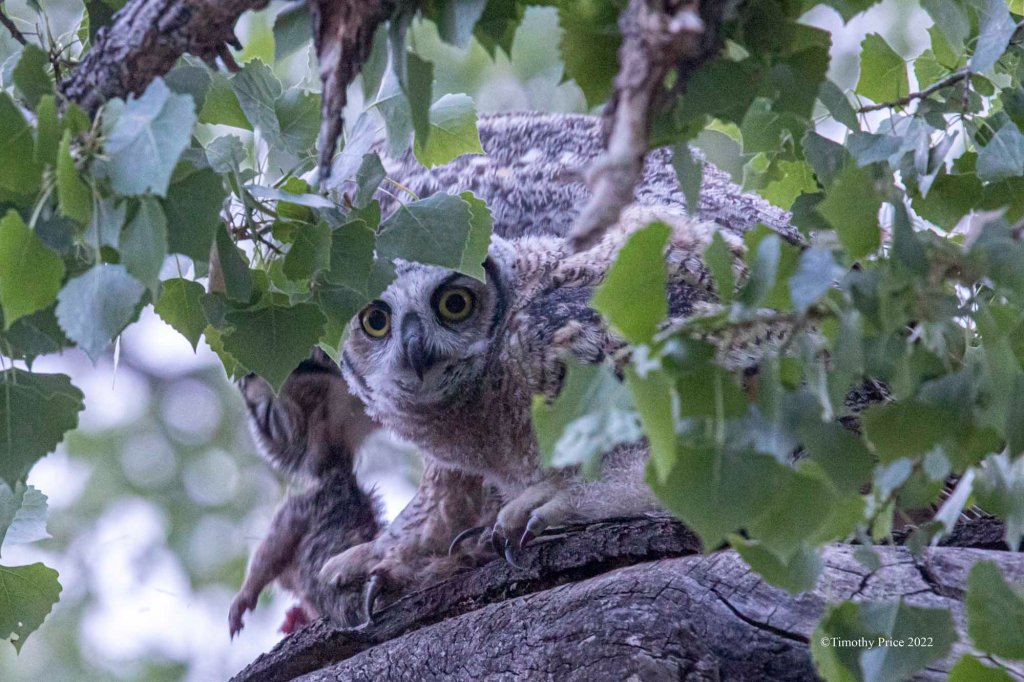 Yesterday, David, a neighbor to the north, said he saw two owlets down by where he lives. We went to check it out and only saw an adult owl. I went back to see if they were out tonight. Not only were they out, but the owlet’s mama was also feeding one of them a squirrel.