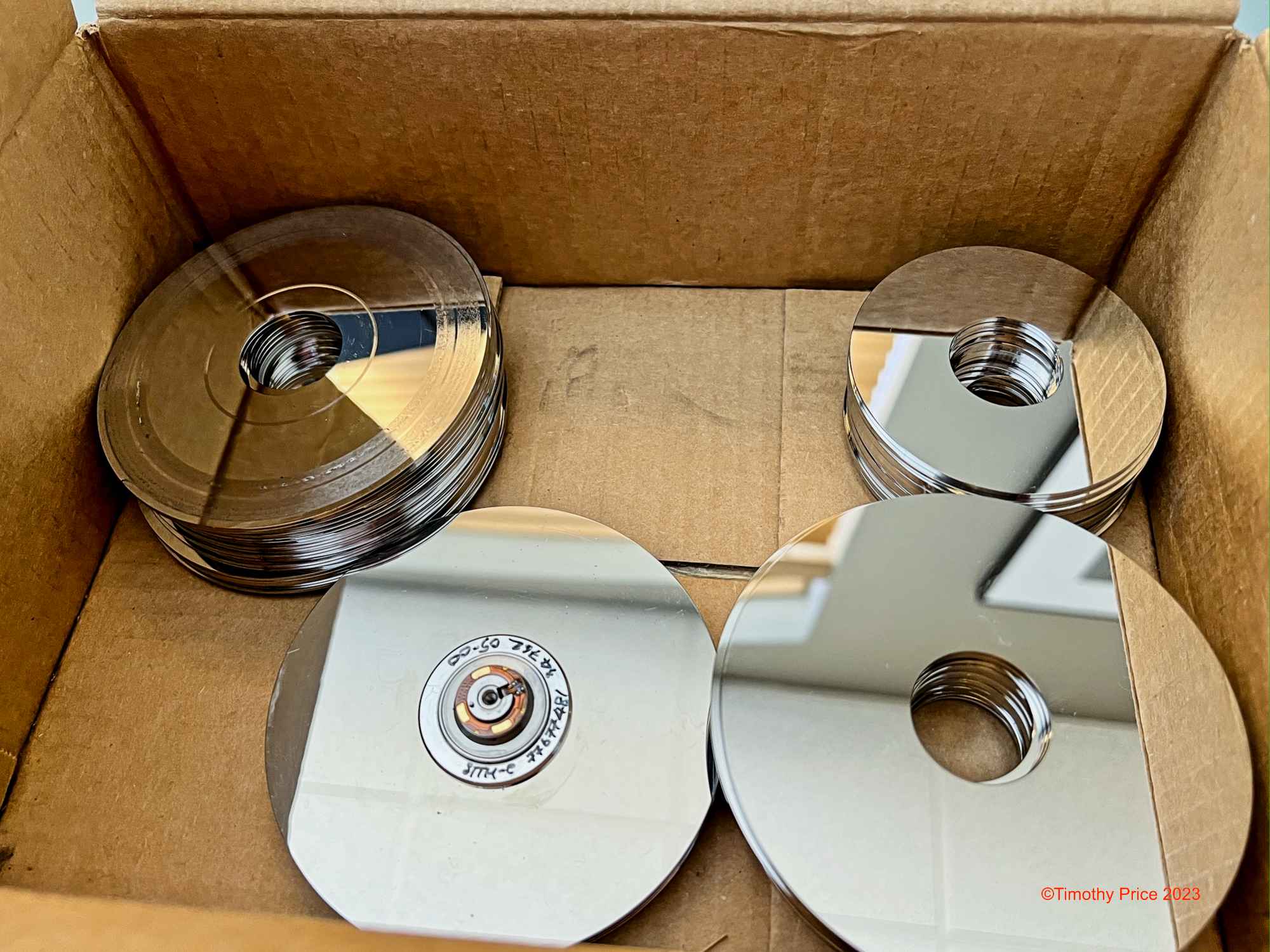 I could have taken them to an electronics recycler, but they charge a fee to destroy hard drives. But I wouldn’t know that the drives were truly destroyed unless I witnessed the recycler destroying the drives. So I took the drives apart and threw the drive cases in one box, the tops off the drives in a second box, the circuit boards, the swingarm, and other plastic parts in a third box, and the platters in a fourth box. I put all the rings and turnstiles in a bag. It seems they could be used to make jewelry or other crafty things. Things like the “my little pillow” filters went into the trash, and all the screws were tossed into a plastic thingamajig parts drawer.