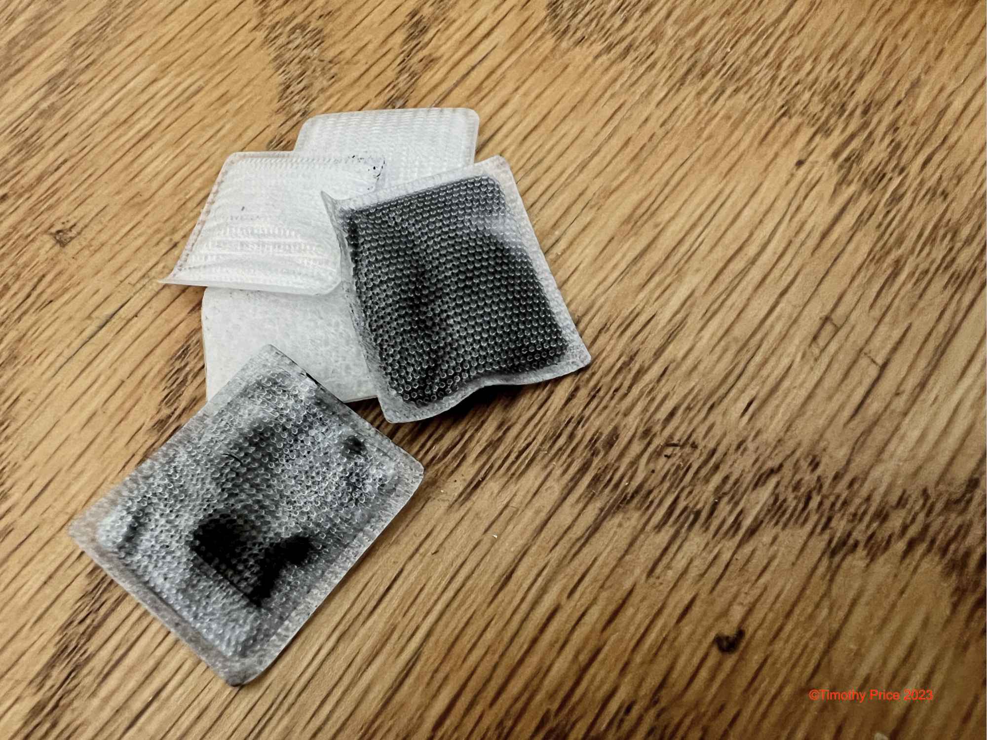 “My little pillow” filters. Most filters were clean, but the drives with trashed platters had black filters. The drives also had little clear plastic cases filled with metallic-looking pellets that seemed like hard drive catalytic converters. They were most likely dehumidifiers.