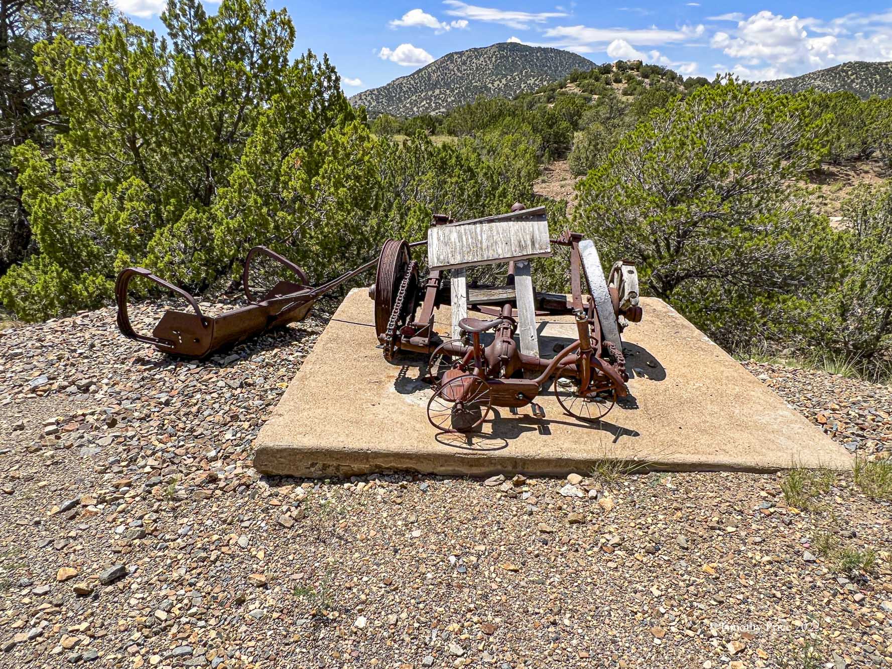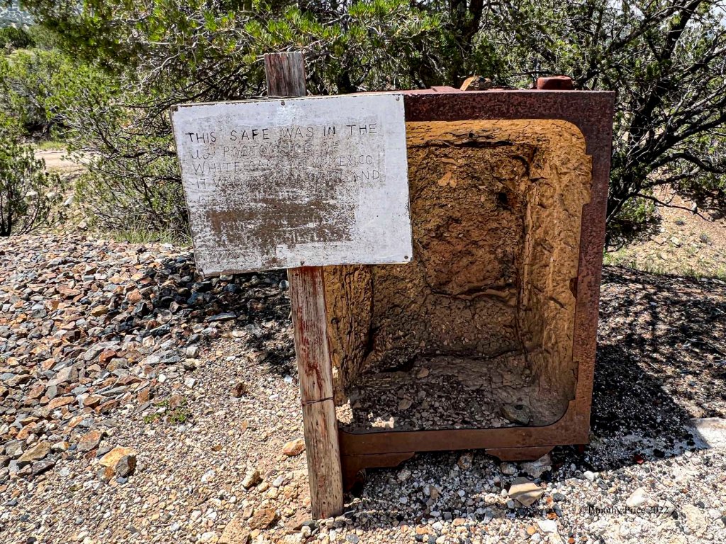 A safe from the old post office and bile of mystery metal. Although there is an old tricycle on the concrete slab.