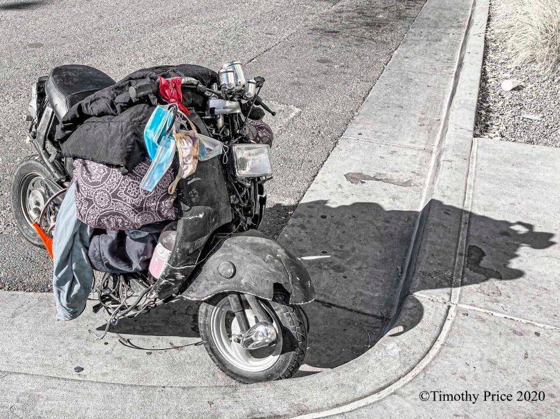 Traded in her shopping cart for a Vespa Scooter. Downtown Albuquerque, New Mexico, USA.
