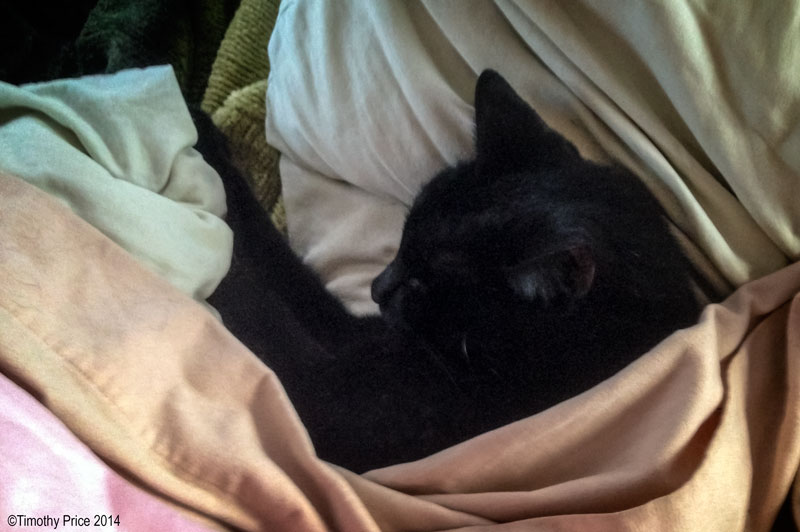 Rosencrantz was so cute sleeping in, that I had to do a photo. I got only one shot of him sleeping before he kitty-sensed my camera, woke up, and looked around a bit disoriented. He was definitely unhappy with me disturbing his bliss by taking a photo of him while he was sleeping.