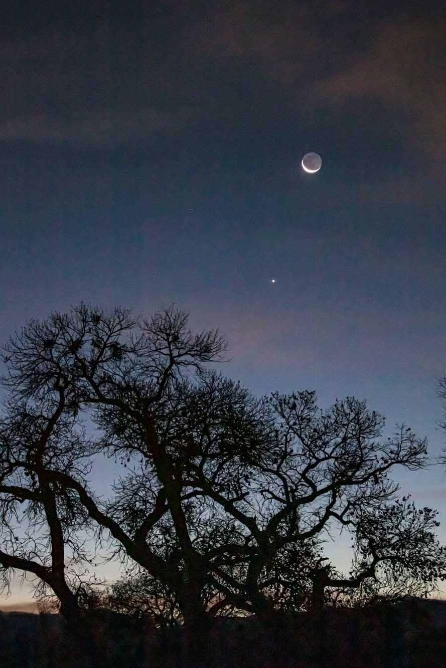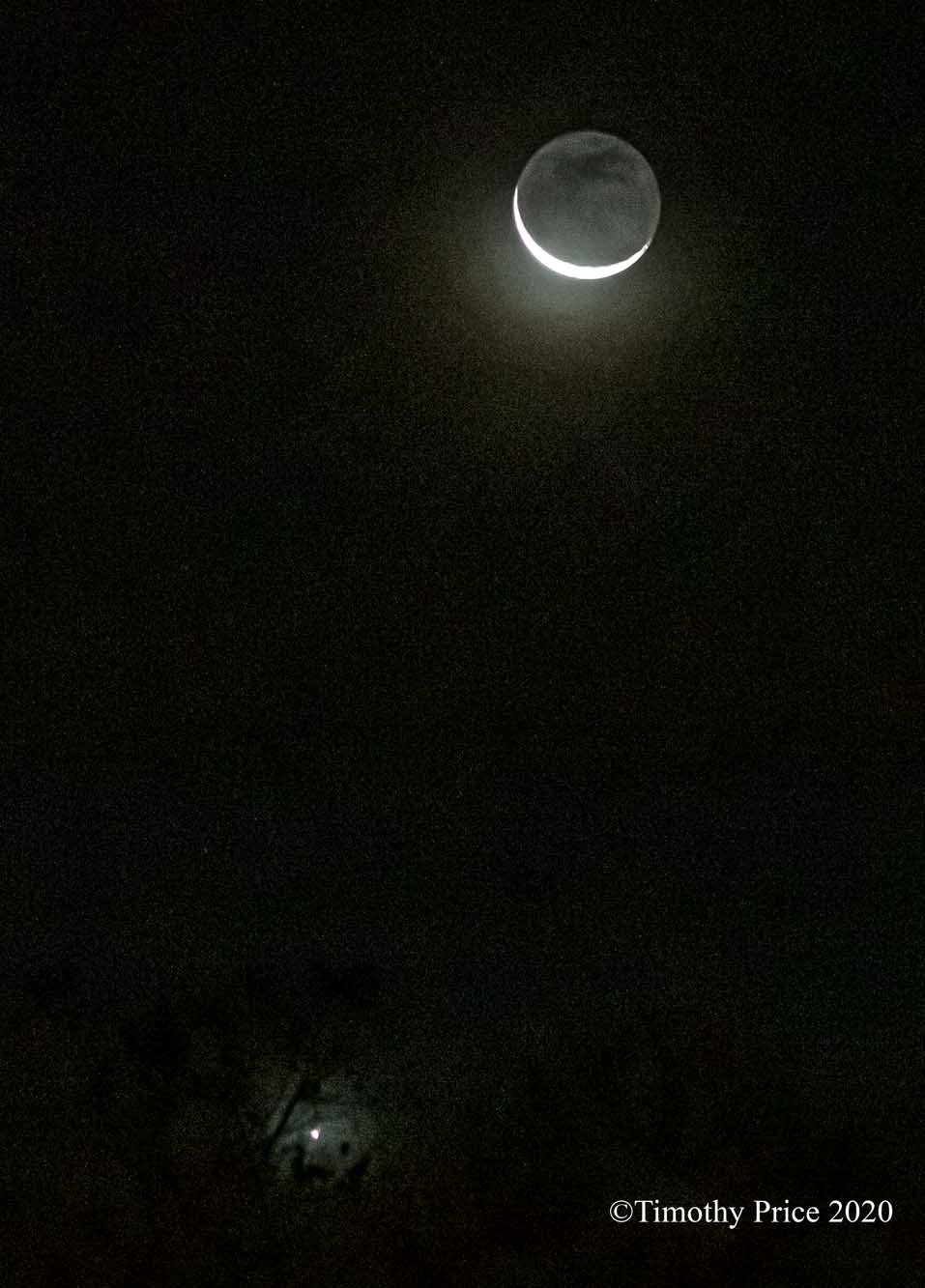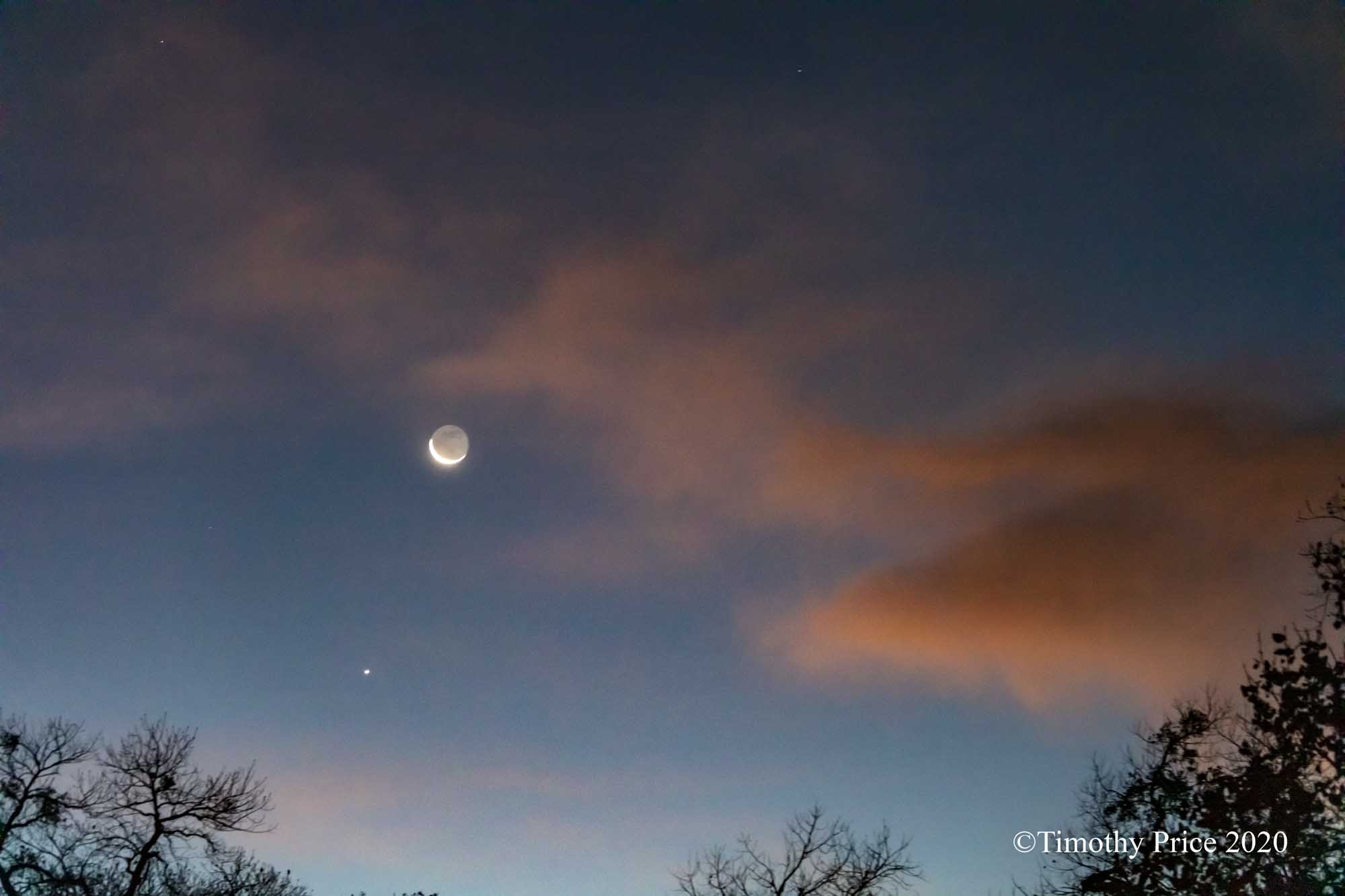 An alignment of Jupiter, Bringer of Jollity, a plane, and the Sliver Moon under the Tangle Heart Tree. Saturn is trying to shine through the clouds above Jupiter.