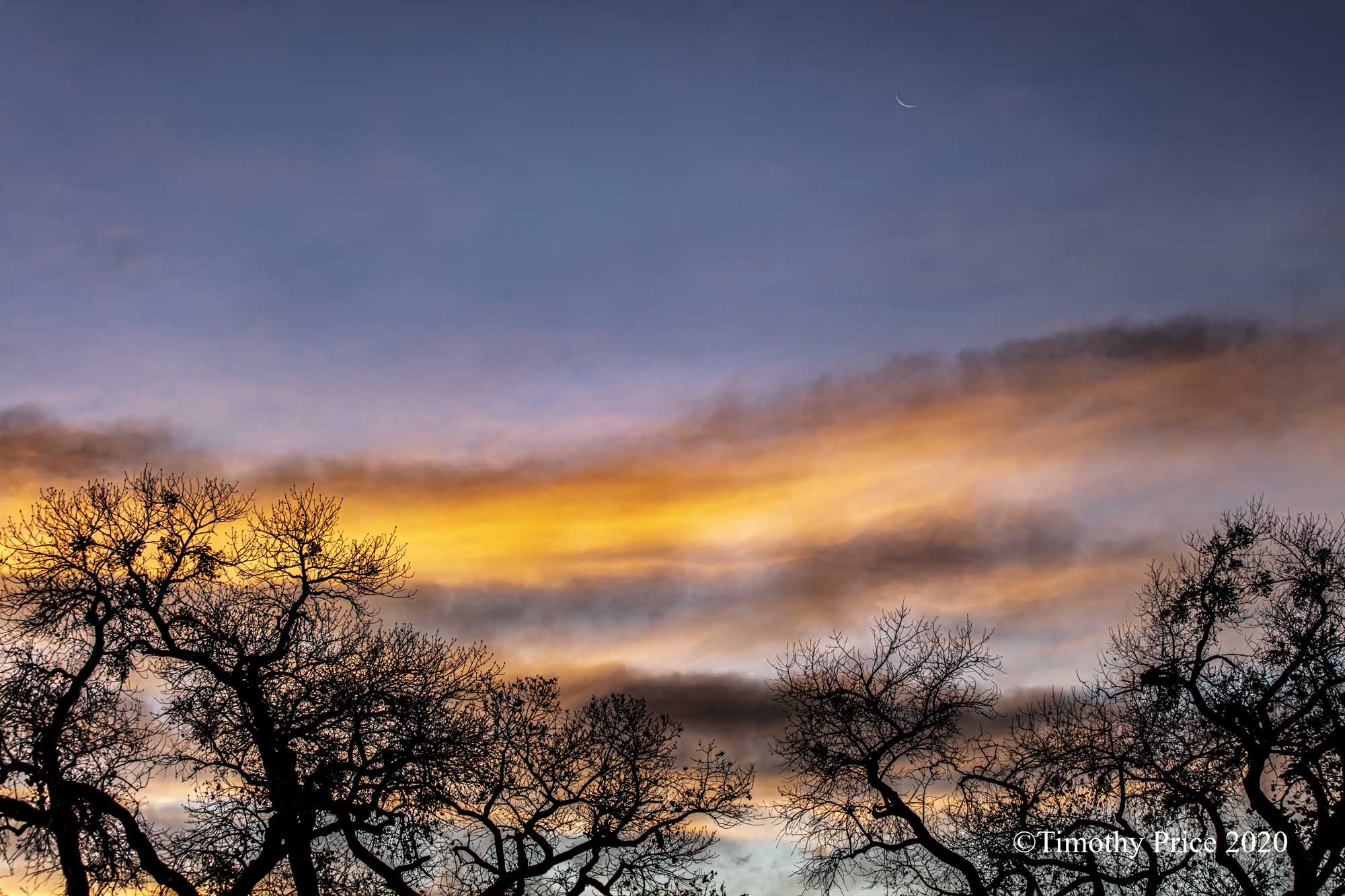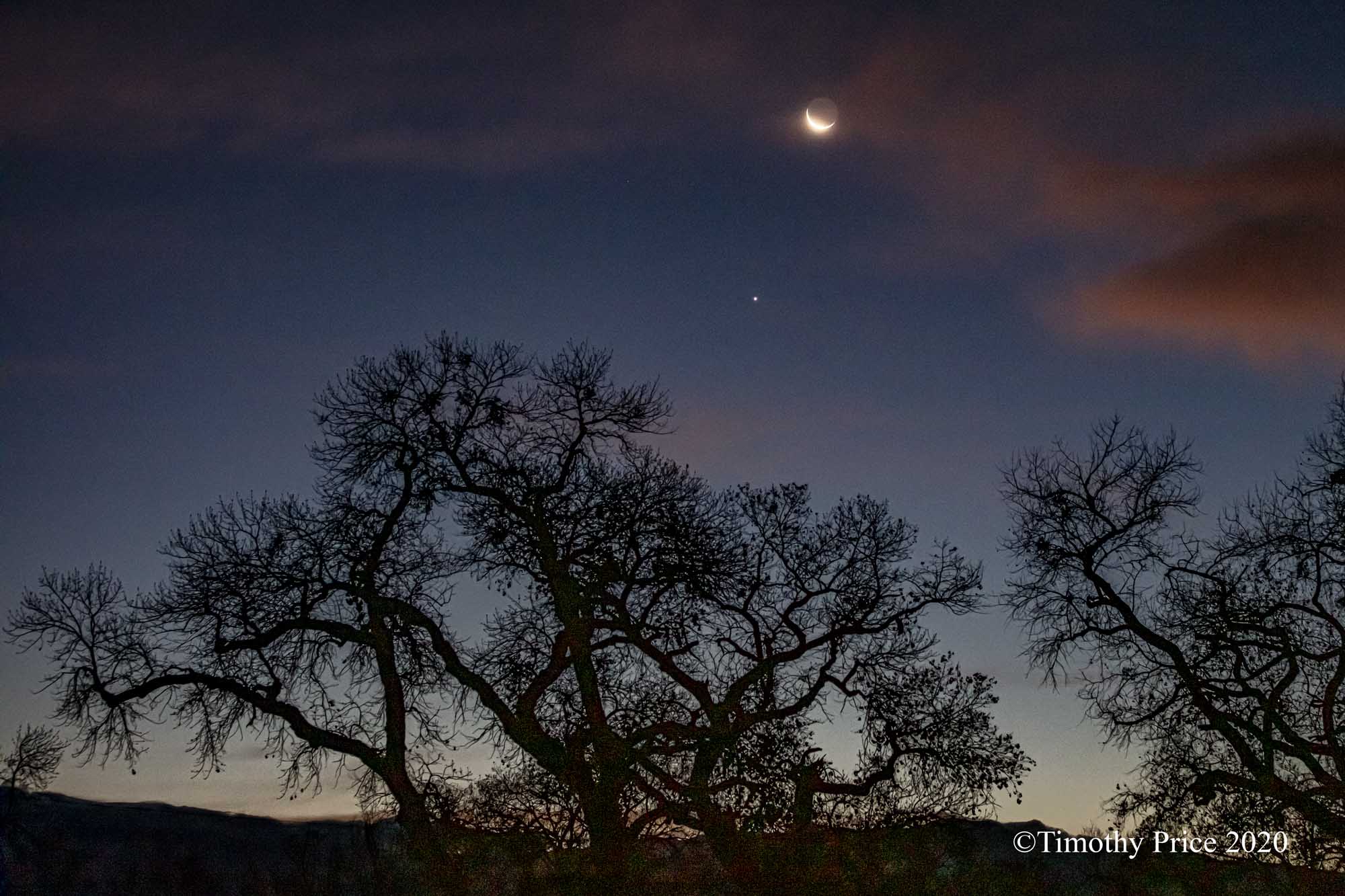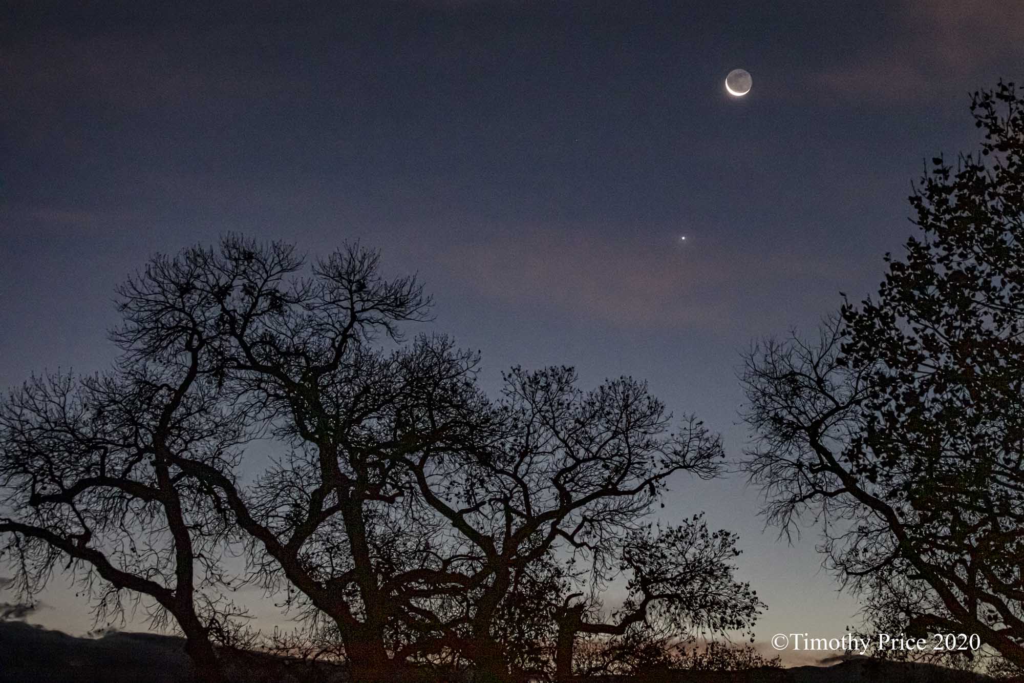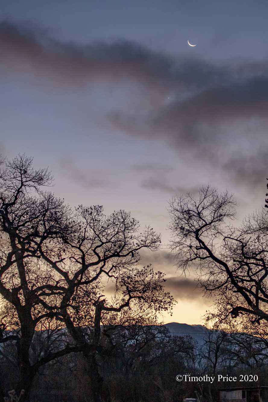 I woke up at 5:45 am this morning to a sliver moon peeking through the window and Venus hanging out in the trees. I got up, put on shoes, checked the temp, 18º F outside, grabbed my camera, and headed out into the cold and dark. I took a series of photos of the moon and Venus rising over the next hour.