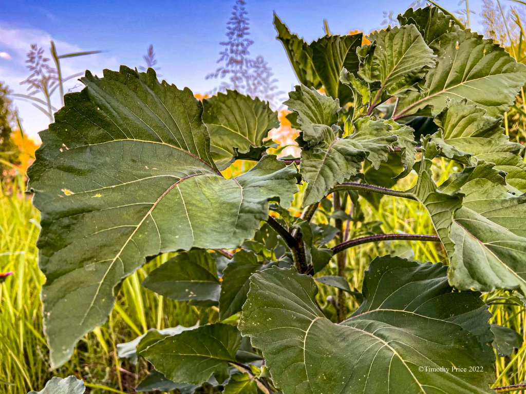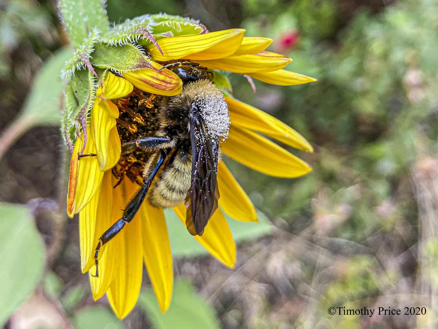 This is a large native bee of some kind, but I don’t know what its name is. It’s the same size as a bumblebee, but longer, with a more greenish color. It was really working the sunflower and had pollen on its back instead of its legs. I’m seeing fewer bees as the temps are dropping at night. Leaves are starting to turn yellow and I’ve seen a few dead bumblebees on the ground.