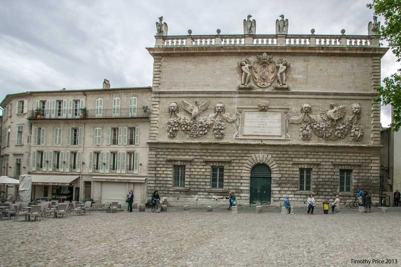 We took the long road to Avignon and visited the market at Lourmarin where we got cheese, meat and bread to eat along the way. The large, half round of cheese in the first photo is Cantal. We have a recipe that calls for cantal, but I couldn’t find it in Albuquerque. There is a castle in Lourmarin as well. Then we drove to Bonnieux, a picturesque 12th century village built on a hill. The photo with the church in the foreground shows Mont Ventoux in the background. We passed by an old bridge that was probably either Visigoth or Roman on our way to Roussillon. There is a similar bridge in northern Spain that is Visigoth. Roussillon is painted with the red and yellow pigments they make from the soil in the area. We ate lunch on a bench in an area protected from the wind and watched the light change on Mont Ventoux in the distance. You can tour the valley and the operation for making the pigments, but it was cold and windy so we didn’t do the tour. Gordes is an amazingly beautiful village built on and in the rocks on the side of a hill. After Gordes we visited Fontaine du Vaucluse, which is a headwater, but instead of a trickle of water from a melting snow pack that eventually turns into a river, Fontaine du Vaucluse produces volumes of water gushing from a spring. Parking was expensive, so we didn’t stop and get photos. After almost seven hours visiting , we made it to Avignon. Avignon is a large city, so it takes a bit of driving to get to the old city still surrounded by a wall. The Papal Palace is quite an imposing structure, a very well fortified building.
