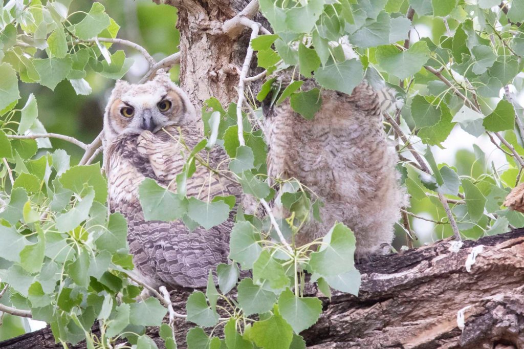 Paul and Mary. Daddy Owl was sitting in a cottonwood in the bosque where he could see both of them in their new tree between the ditches. It will be interesting to see how long it is before they fly into the bosque.