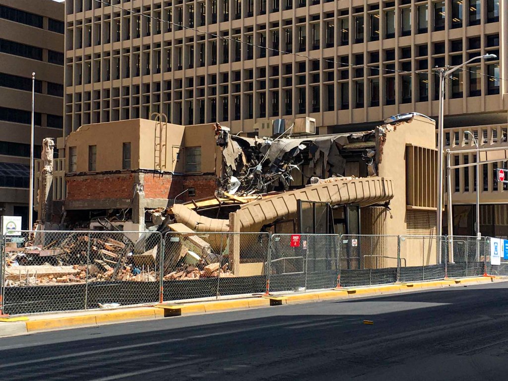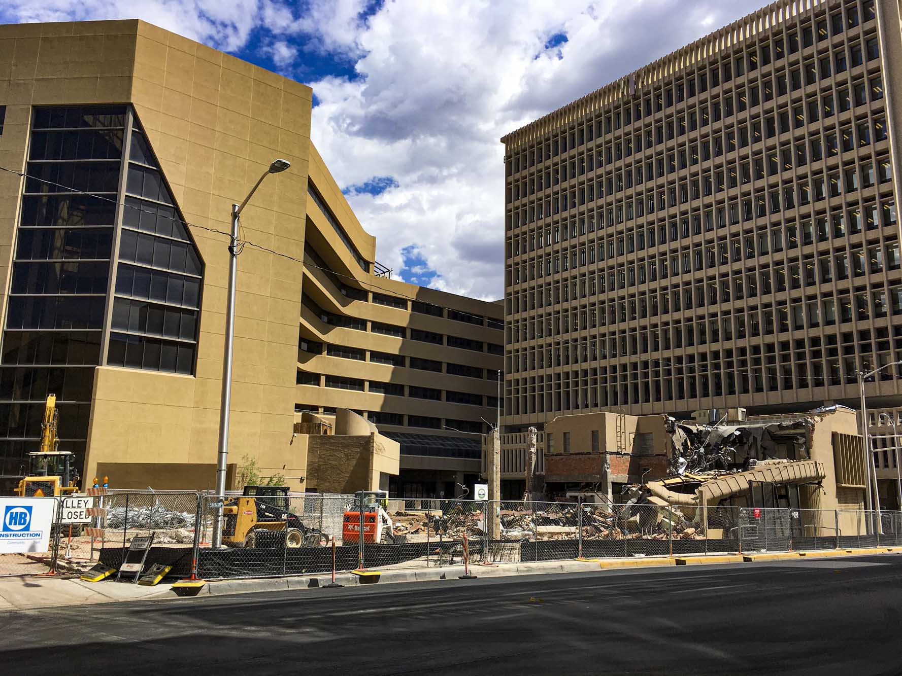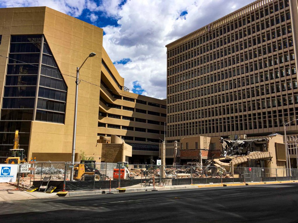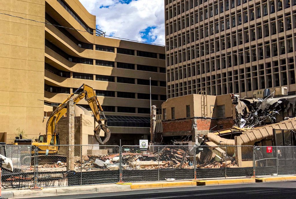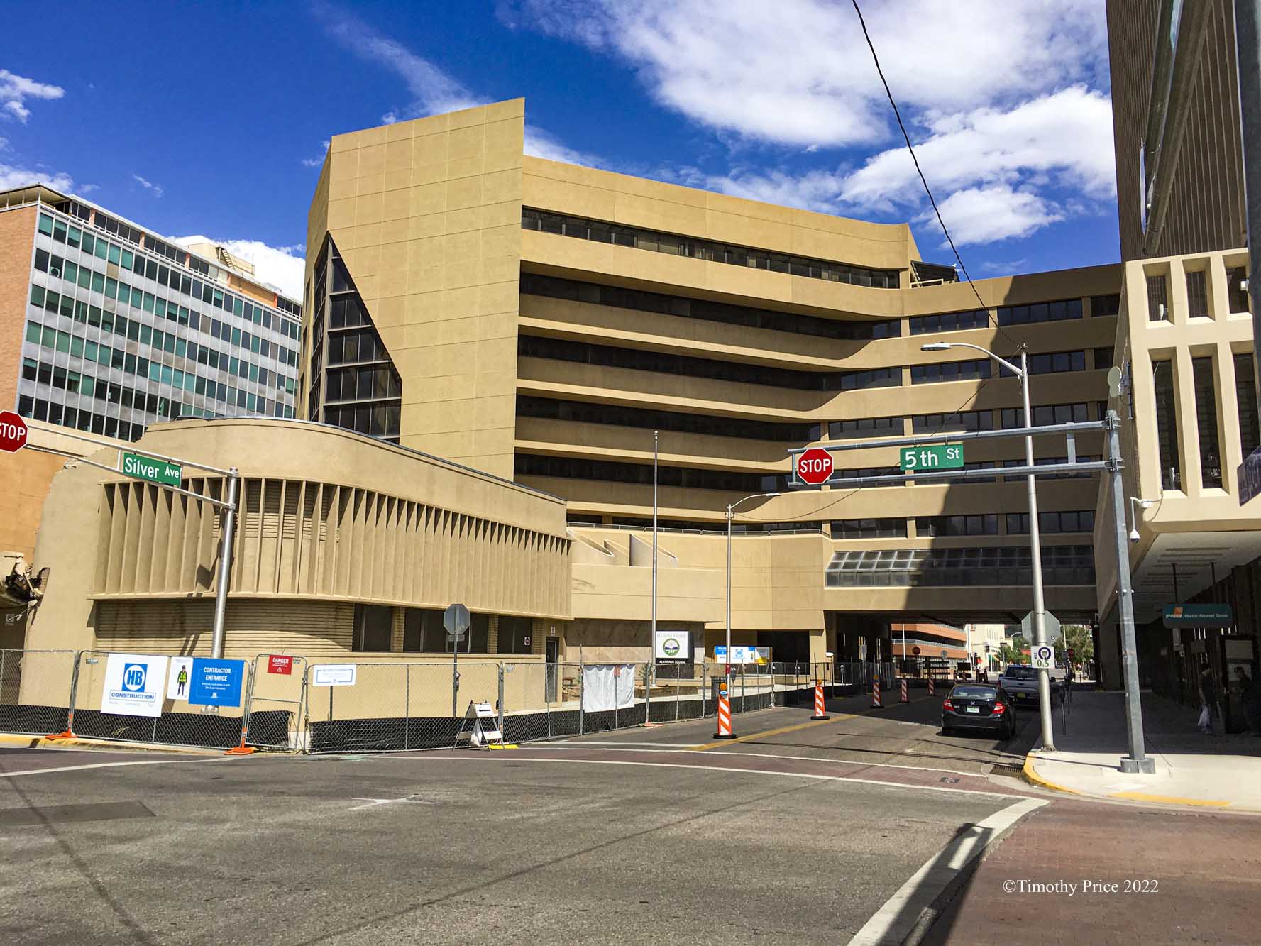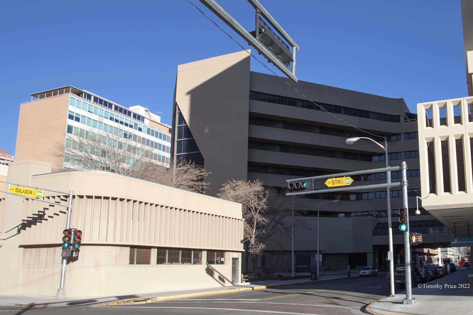 The PNM Building in 2019. Bernalillo County purchased the building and was renovating it. The round-cornered building on the NE corner of 5th and Silver was demolished to build new chambers for the County Commission.