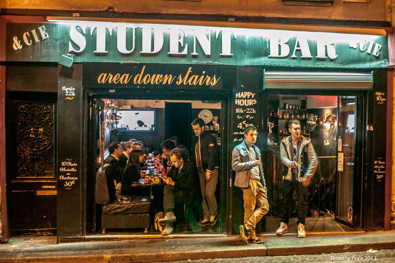 Today we went by the outdoor market on our way to the Rodin Sculpture Garden, Napoleon’s tomb, the Military Museum and Map Museum as part of the class. Then Laurie and I walked to the Cimetière du Montparnasse, found Serge Gainsbourg’s grave, then walked back to the hotel. We walked to a restaurant that specialized in crepes for dinner, which was a mile and a half from the Hotel. The crepes were delicious, and a couple of women sitting at the end of our table gave us a sample of their apple cider, which was really good — it reminded us of Spain. After dinner we walk back to the hotel, which was mostly along Rue Mouffetard. A light rain was falling making the air slightly hazy and the stone streets glisten. One of the stores we walked by had Moulin Rouge Goth style dresses and an ad for a Goth-style model. There were several bars and food places along the walk, and the dog in the second photo was part of the crepe restaurant. I measured our walk on Google Map Pedometer and got 6.5 miles for the day.