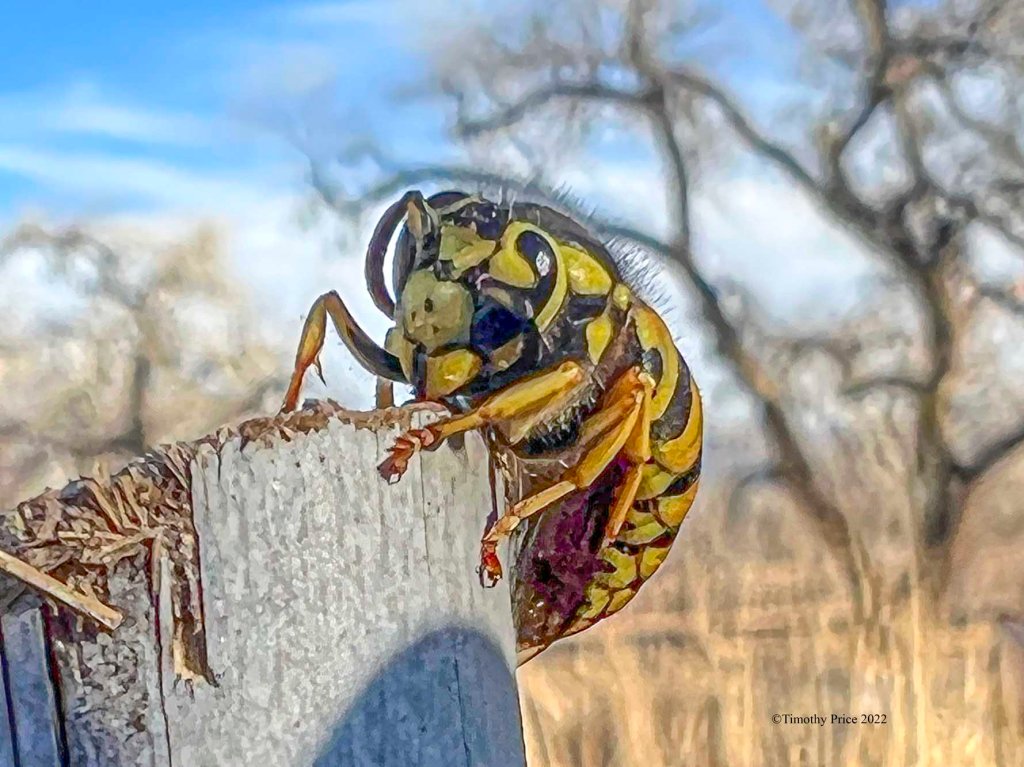 Tristan found this wasp with her wings tucked under her while we were setting up for Reyes. Tristan put the wasp in a container with some honey to see how long she will last. The wasp may be an old lady since she was found snuggled up by herself in one of our cushions on the deck.